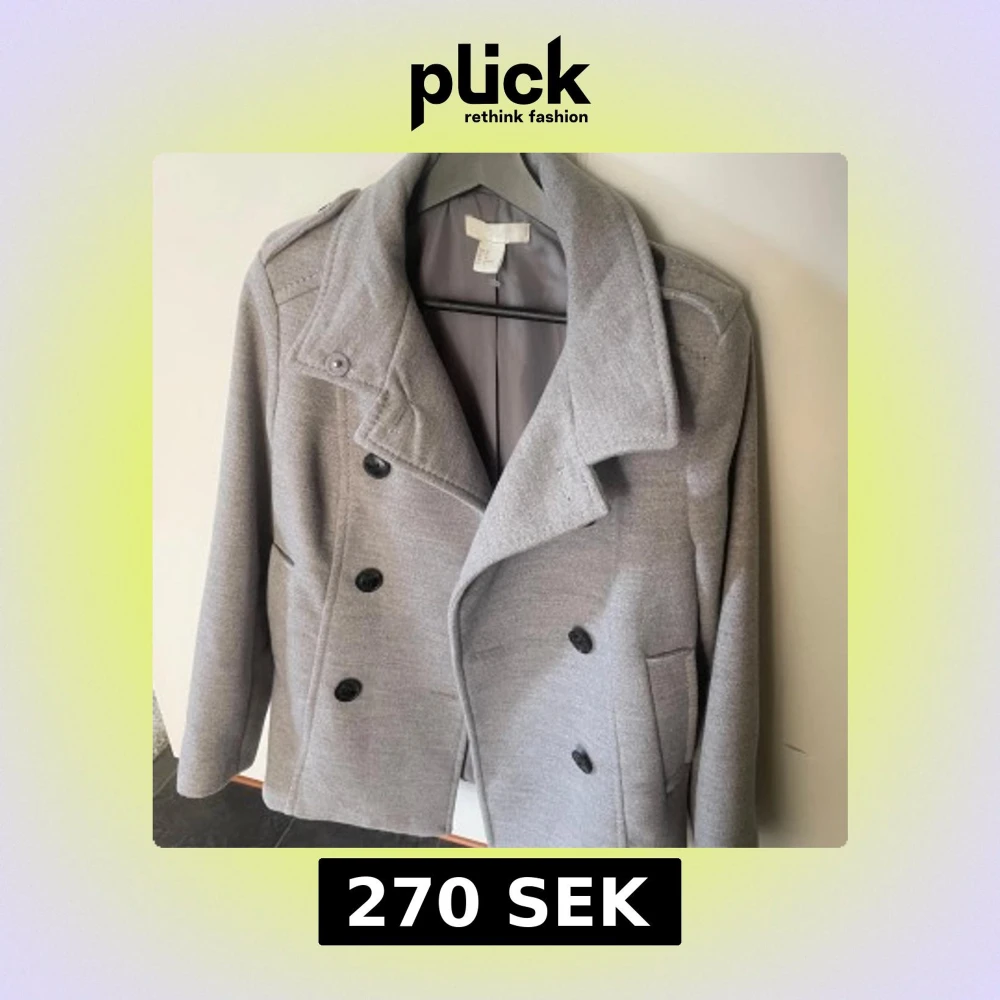 Stilren ljusgrå kappa från H&M med dubbelknäppning och bred krage. Jackan har svarta knappar, axelklaffar och två fickor framtill. Perfekt för dig som vill ha en klassisk och snygg look. Använd väldigt få gånger.