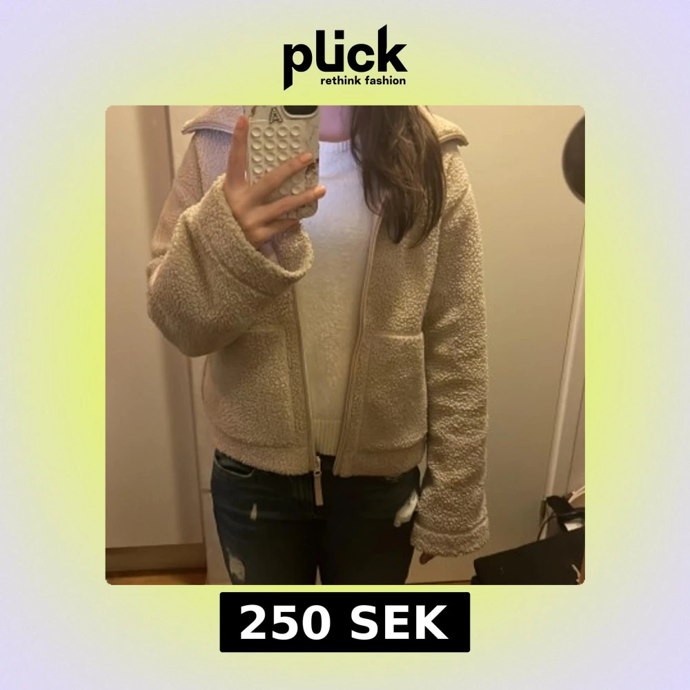 Mysig beige teddyjacka med dragkedja framtill. Jackan har långa ärmar och en bekväm passform, perfekt för kyligare dagar. Den fluffiga texturen ger en trendig look. Jackan är i storlek S och kommer ifrån HM❤️