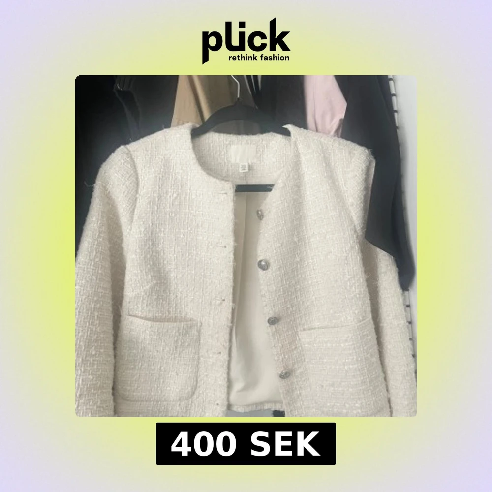 Säljer en elegant vit kavaj från H&M i ett stilrent och klassiskt snitt. Kavajen har en rund halsringning och knäpps med dekorativa knappar framtill. Den är tillverkad i ett texturerat material som ger en lyxig känsla.köpte denna för 500kr och säljer den för 400kr, priset kan alltid diskuteras ☺️