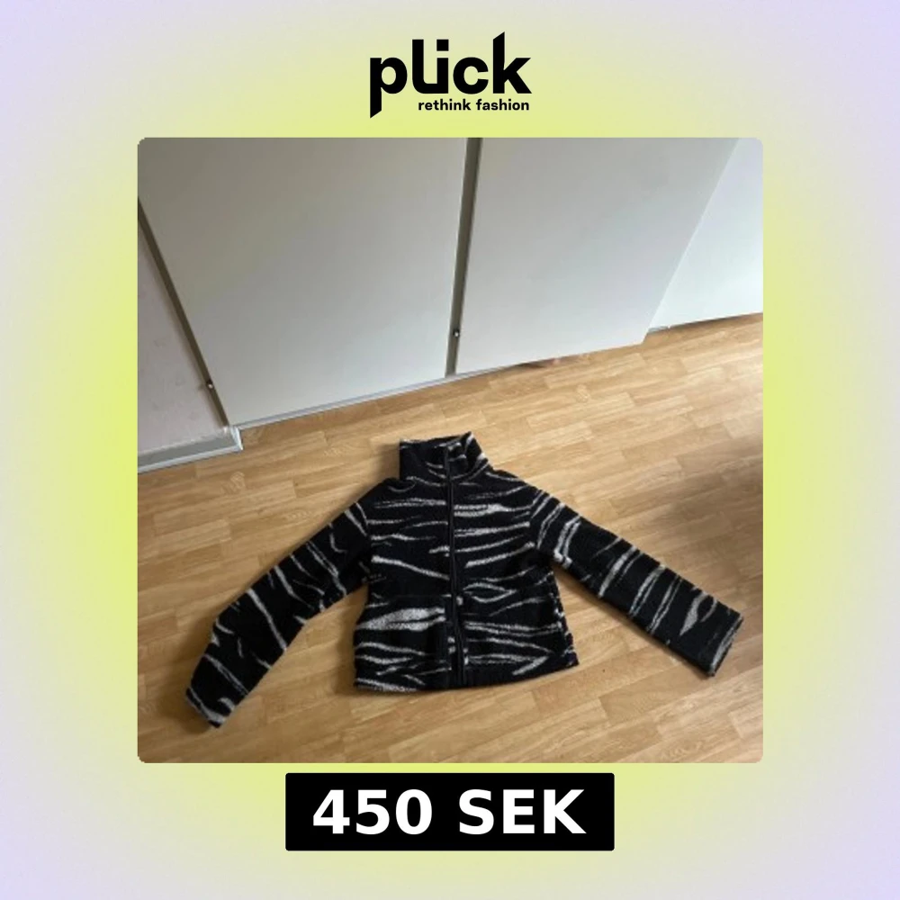 Säljer en svart teddyjacka i storlek S med coolt zebramönster i vitt och grått. Jackan har hög krage, lång ärm och dragkedja framtill. Materialet är fluffigt och mjukt, perfekt för dig som gillar statement-plagg och vill sticka ut.