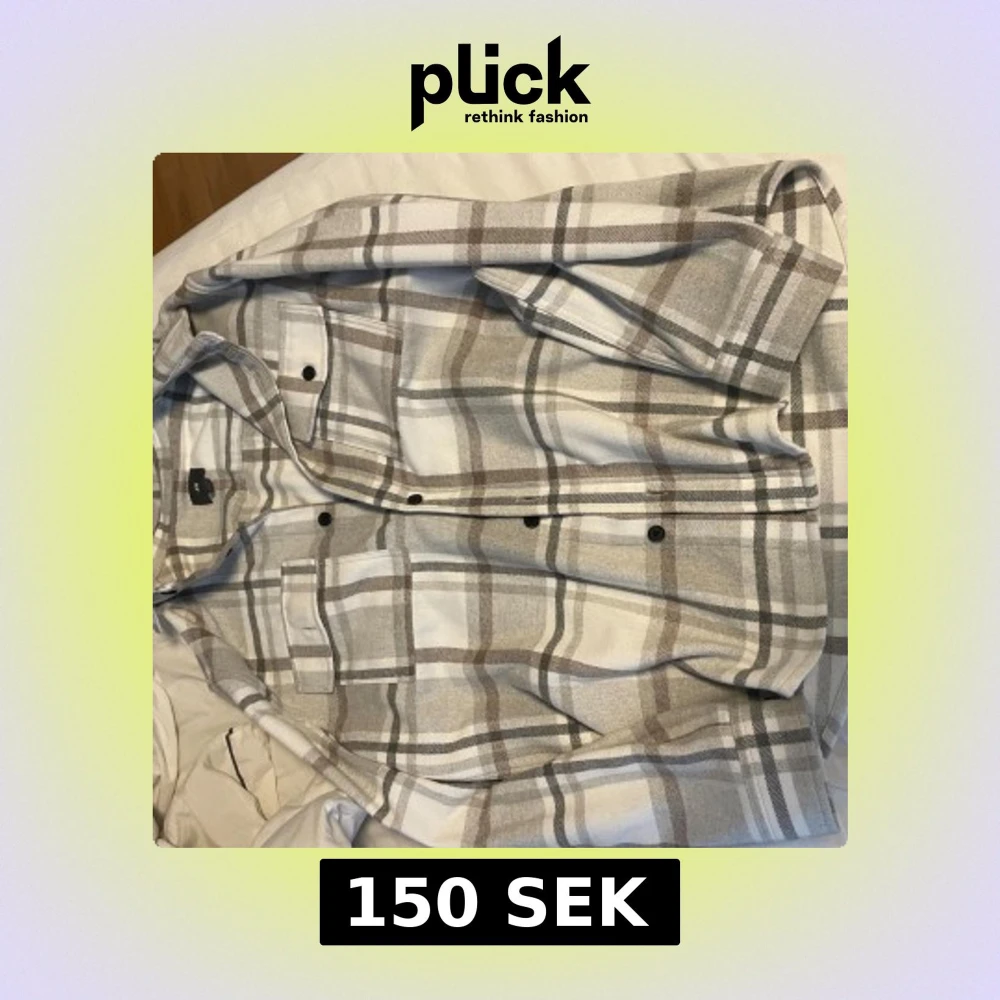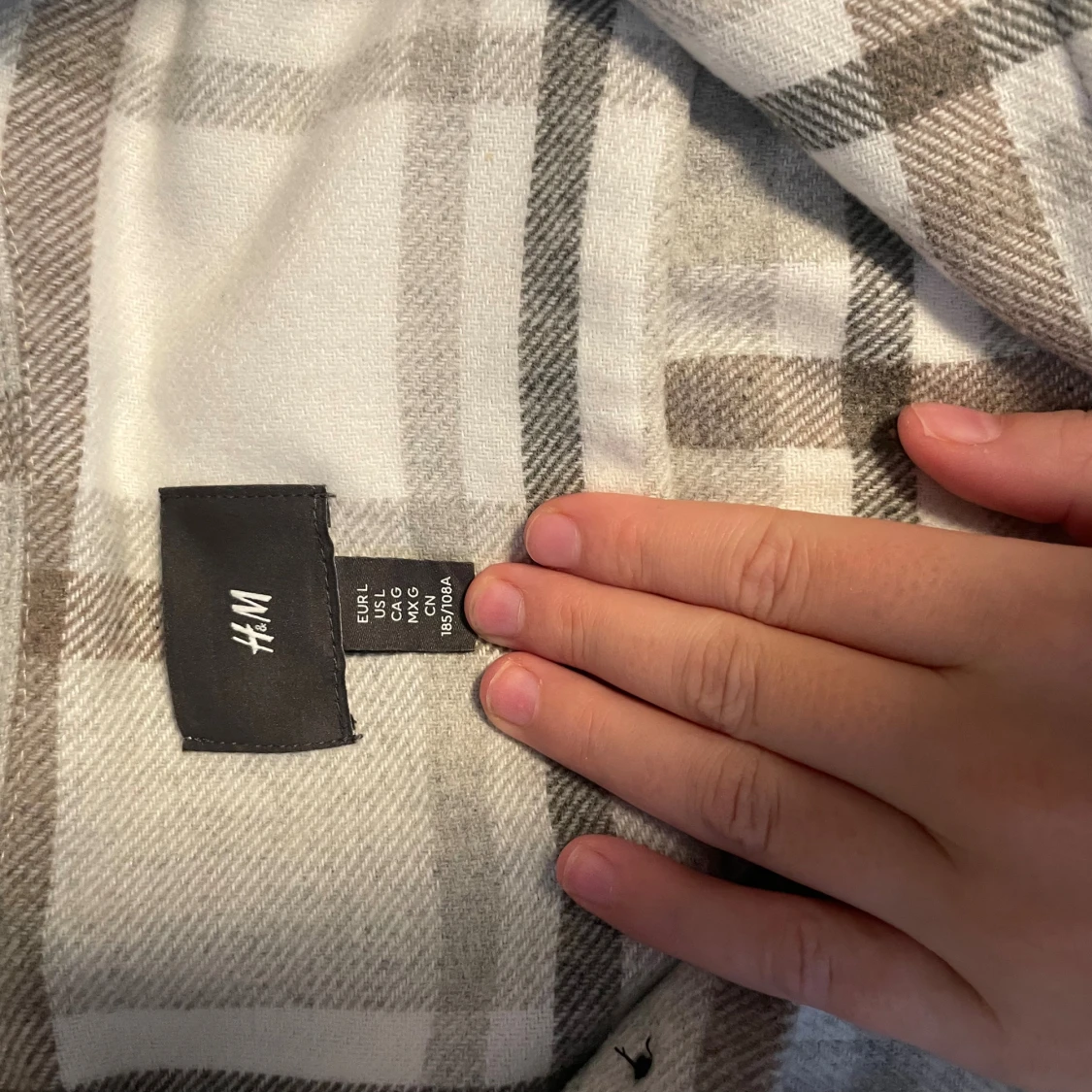 Snygg rutig overshirt från H&M i beige, grått och vitt. Skjortan har klassisk krage, knappar framtill och två bröstfickor. Perfekt lager-på-lager-plagg med avslappnad passform och mjukt material.