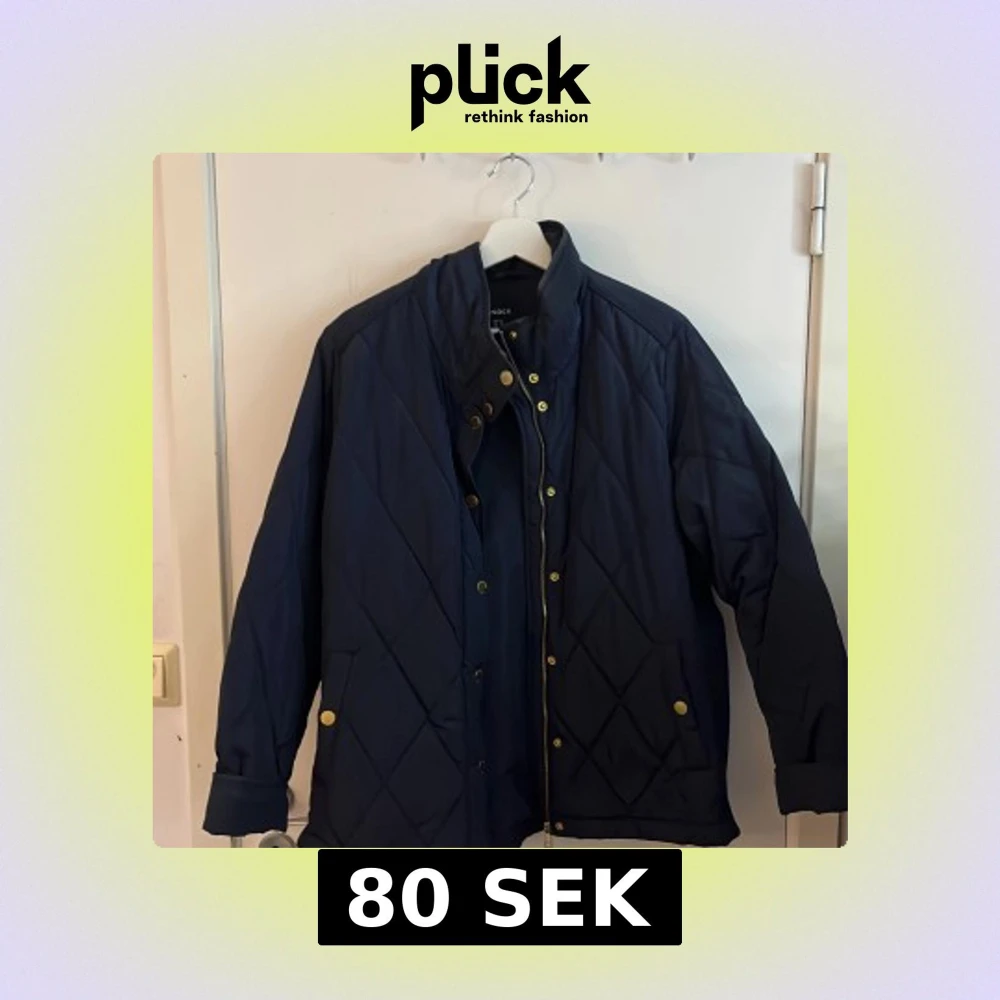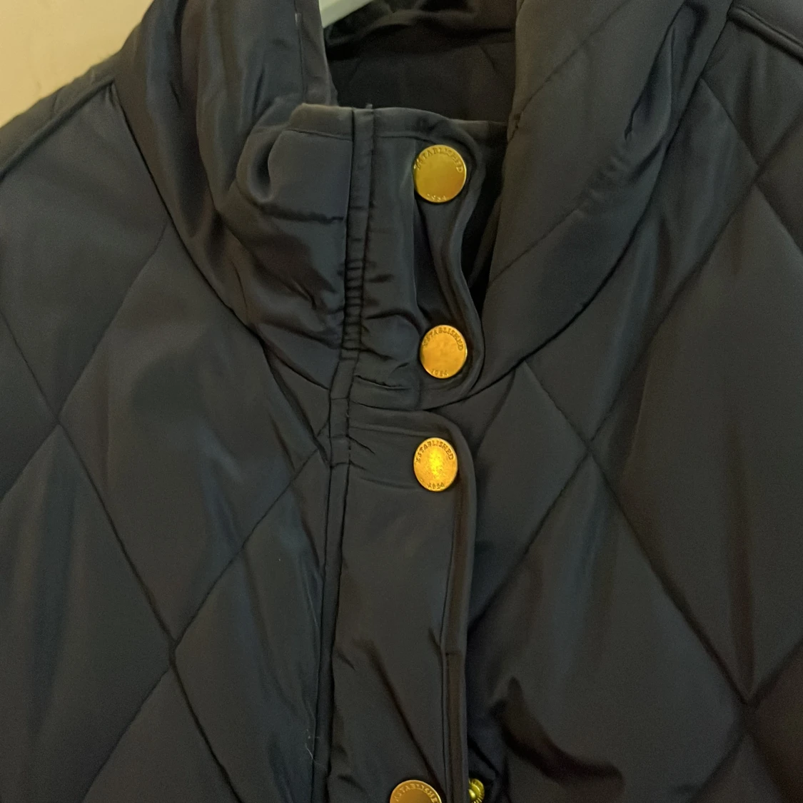 Snygg mörkblå quiltad jacka från Lindex med guldknappar och hög krage. Jackan har långa ärmar och praktiska fickor framtill. Perfekt för kyligare dagar.