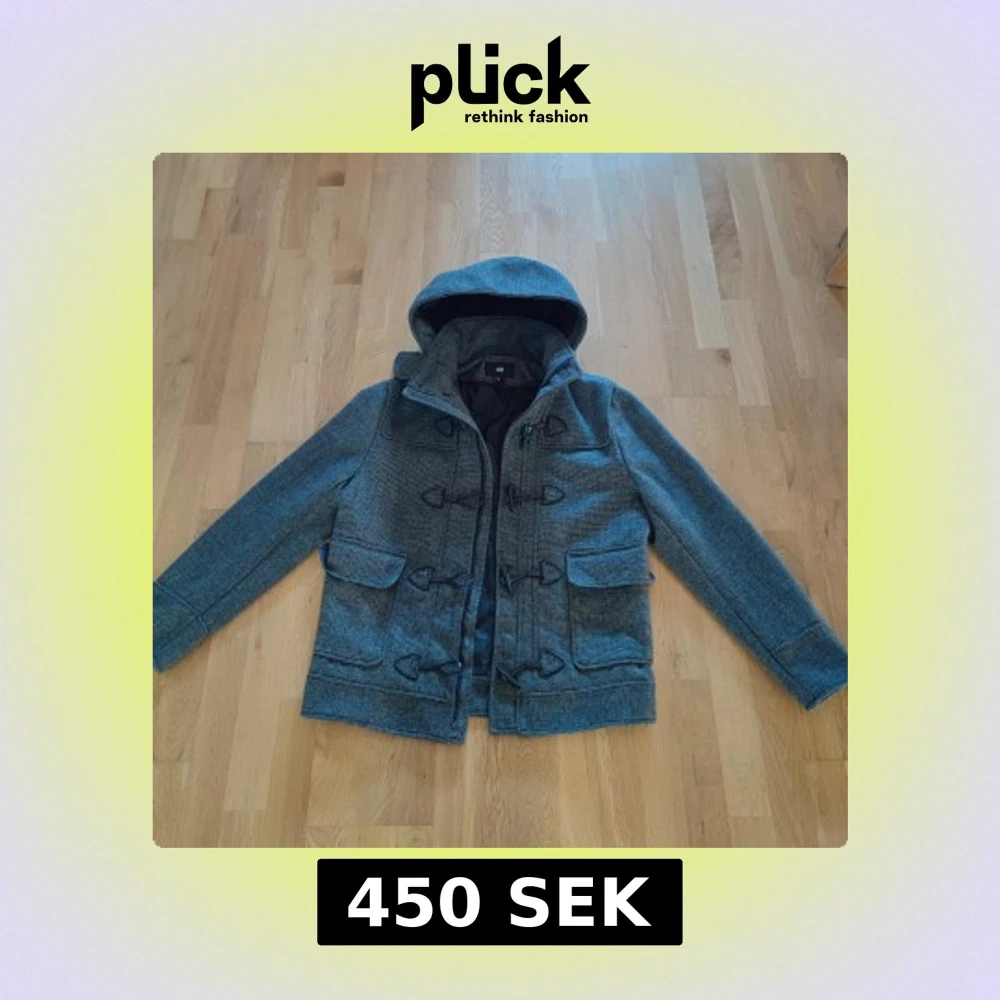 Snygg grå rutig duffeljacka från H&M med huva, svarta förstärkningar på armbågarna och klassiska knäppningar framtill. Jackan har stora fickor med lock och är helfodrad för extra komfort. Perfekt för kyliga dagar när du vill ha en stilren look.