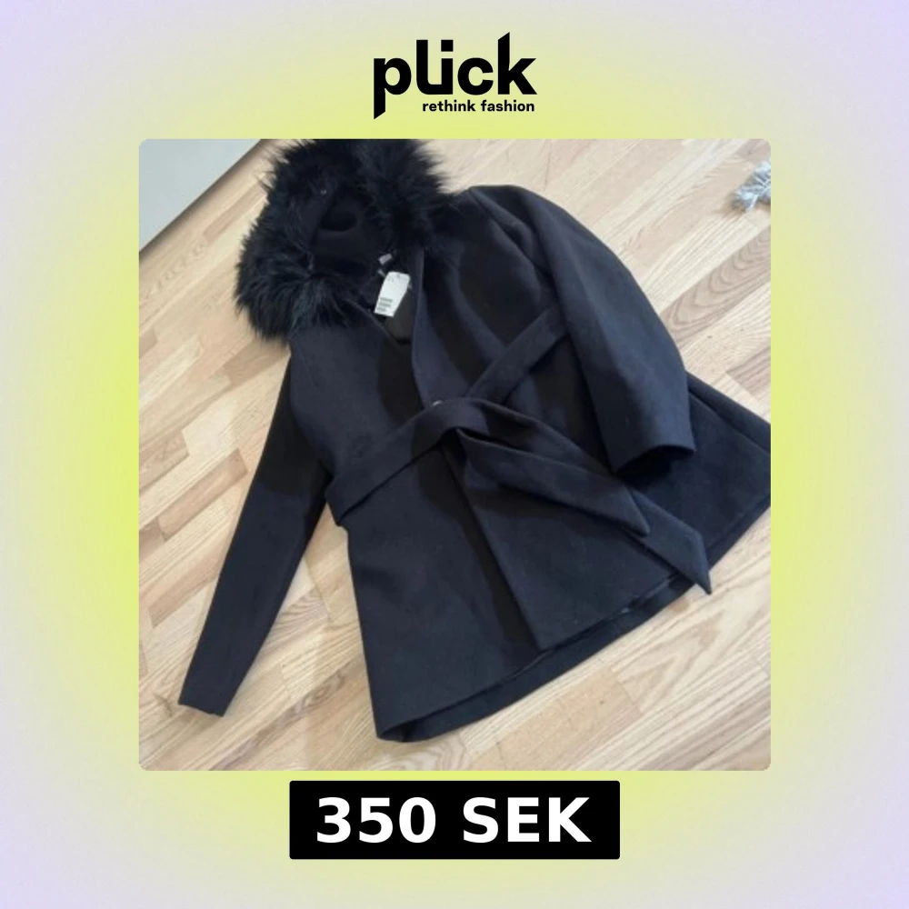 Stilren svart kappa från H&M med huva och fuskpälsdetalj. Jackan har knytskärp i midjan och lång ärm, perfekt för kyliga dagar. Snygg och enkel design som ger en clean look.