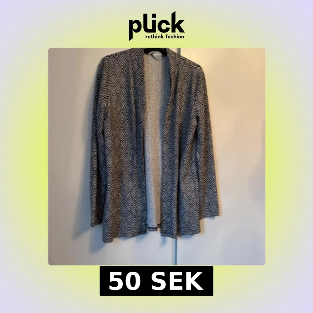 Säljer en svartvit cardigan jacka från H&M i storlek M. Jackan har ett coolt geometriskt mönster med diamanter och är långärmad med öppen front. Materialet är mjukt och känns som bomull, perfekt för lager-på-lager. Passformen är normal och den är riktigt skön att ha på sig.