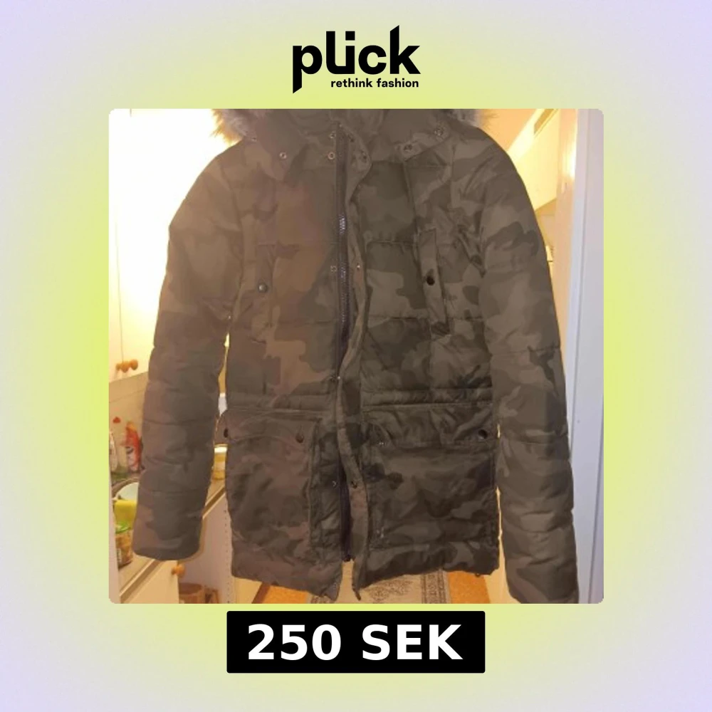Camouflage pufferjacka med fuskpäls