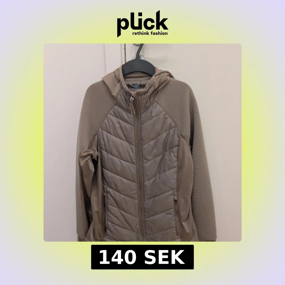 Snygg beige jacka med quiltade partier och ribbade ärmar. Jackan har huva, dragkedja framtill och två fickor med dragkedja. Perfekt för kyliga dagar och har en sportig vibe. Materialmix med syntet och polyester för extra komfort.