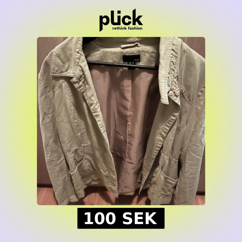 Stilren beige kavajjacka från H&M med klassisk krage, knappar och två stora fickor framtill. Jackan är tillverkad i ett mjukt bomullsmaterial och har en avslappnad passform som passar perfekt till många olika looks.