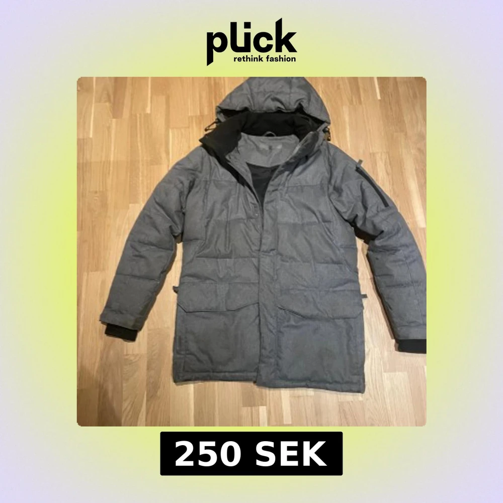 Säljer en grå pufferjacka med huva och praktiska fickor framtill. Jackan har quiltad design, lång ärm med svarta muddar och dragkedja under frontslån. Perfekt för kalla dagar och har en clean, modern look.