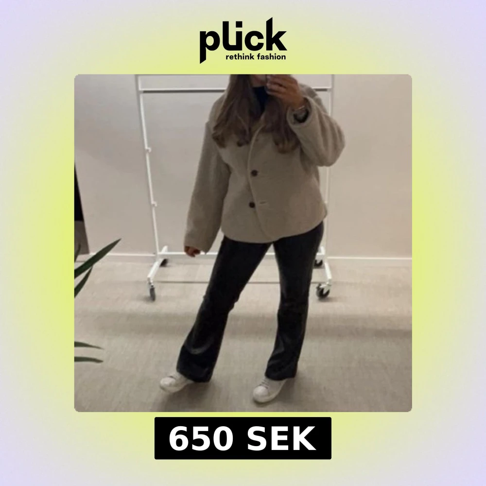 Säljer min beige teddyjacka med oversized passform och svarta knappar framtill. Jackan har bred krage och långa ärmar, perfekt för dig som vill ha en mysig och trendig look.