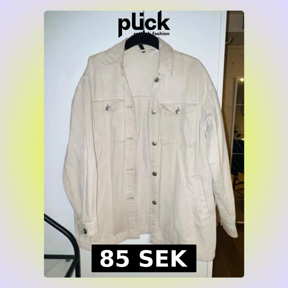 Säljer en beige overshirt i jeansmaterial med klassisk krage och knappar framtill. Två bröstfickor med lock och knapp samt sidofickor. Perfekt att slänga över en hoodie eller t-shirt för en chill look.