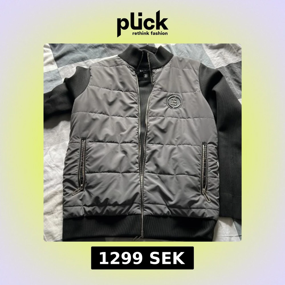 Säljer en snygg grå bomberjacka från Balmain Paris med quiltad framsida och svarta ärmar. Jackan har dragkedja framtill, två fickor med dragkedja och ribbade muddar. Balmain-logga på bröstet ger en exklusiv känsla.