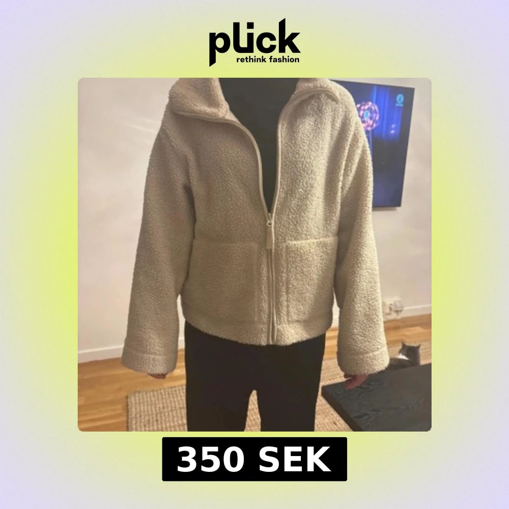 Mysig beige teddyjacka i storlek M med hel dragkedja framtill och två stora fickor. Den är i bra skick och finns inte att köpa längre