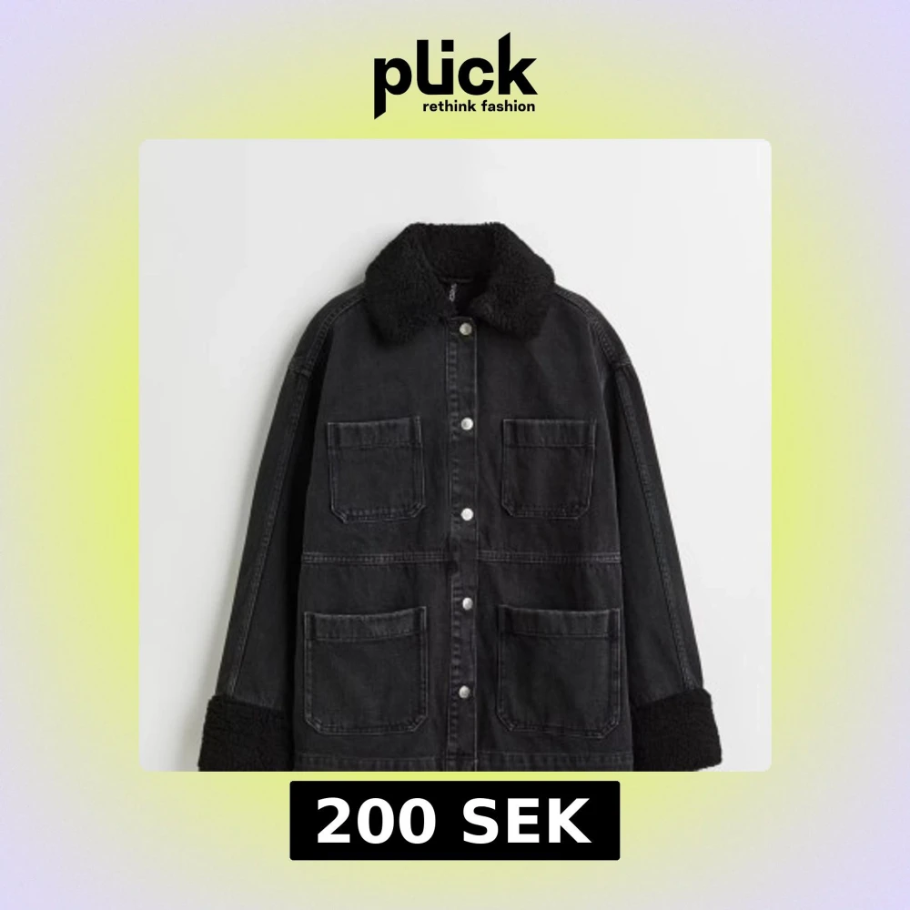 Säljer en svart jeansjacka från H&M med mjuk teddykrage och teddyfoder vid ärmsluten. Jackan har fyra stora fickor framtill och silverfärgade knappar. Passformen är loose och jackan har en cool, oversized vibe som funkar till jeans och sneakers.