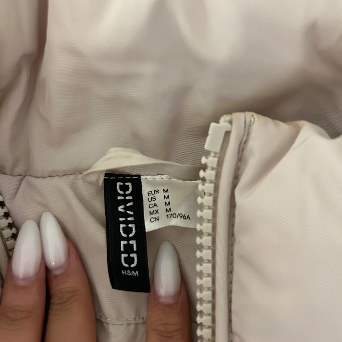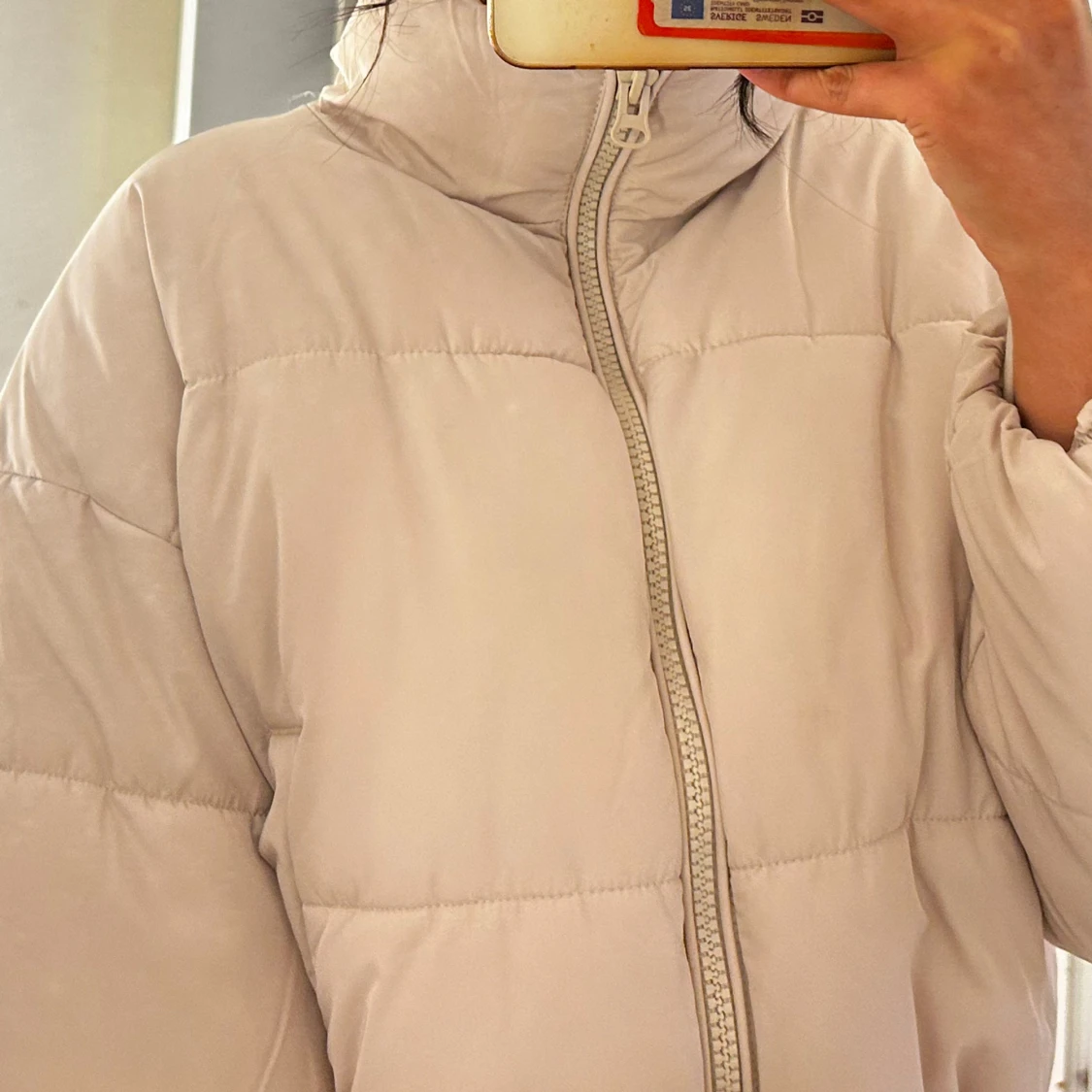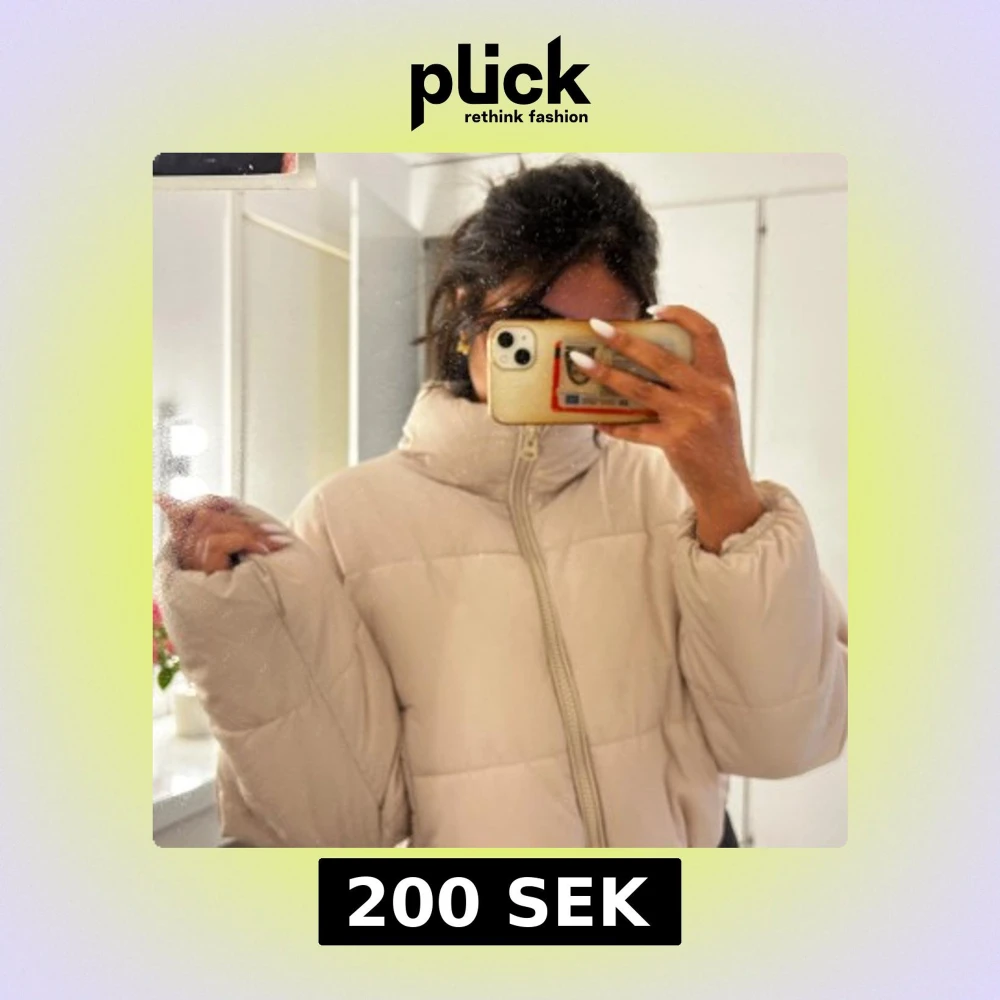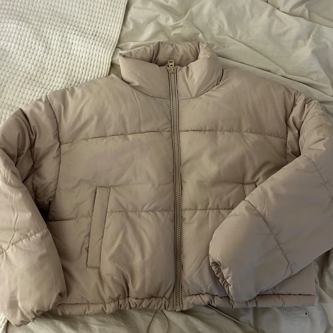 Säljer en beige pufferjacka med hög krage och hel dragkedja framtill. Jackan är quiltad och har en loose passform med långa ärmar och elastisk nederkant. Perfekt för kyliga dagar och enkel att styla till olika outfits.
