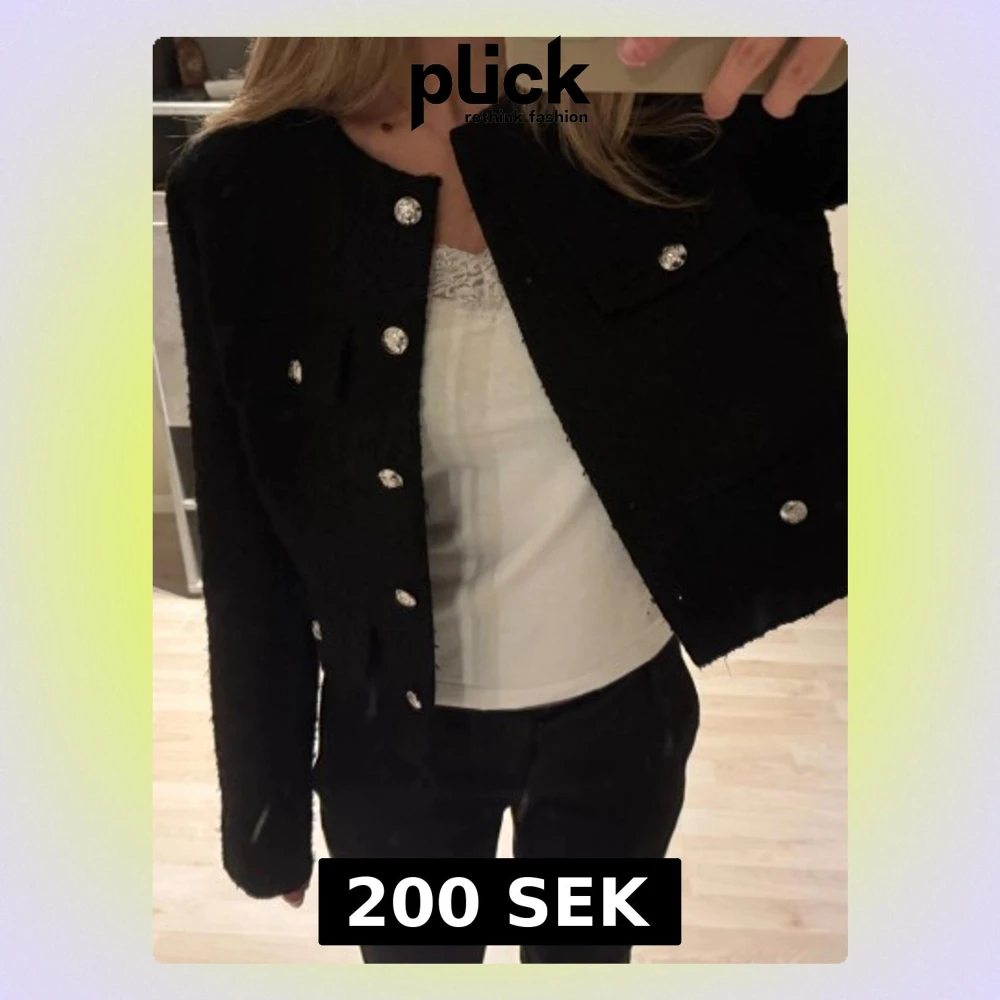 Snygg svart kavajjacka med silver knappar framtill och på fickorna. Jackan är croppad och har en rak, loose passform med lång ärm. Materialet är mjukt och har en lite ruffad yta som ger en cool vibe. Perfekt att styla med jeans eller kostymbyxor.