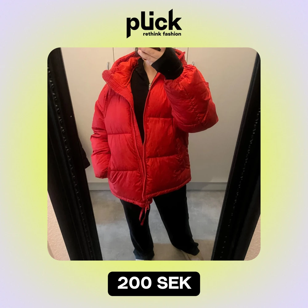 Säljer en snygg röd pufferjacka i bra skick. Den är perfekt för kalla vinterdagar och har en dragkedja framtill. Jackan är oversized och har en mysig huva. Perfekt för att hålla värmen och se stilren ut samtidigt! Har små fläckar men inget som syns