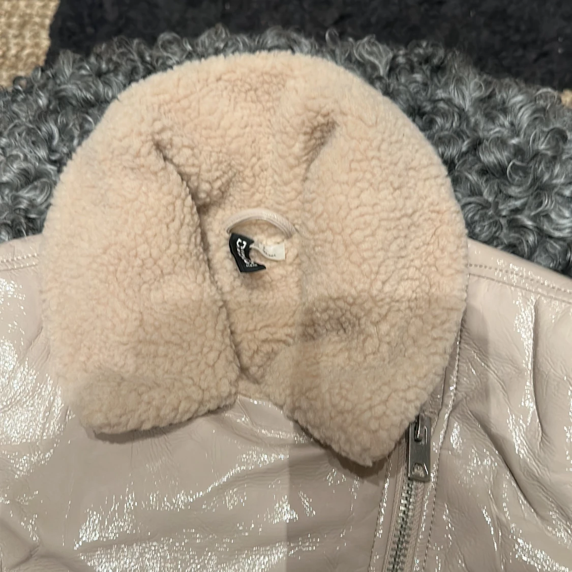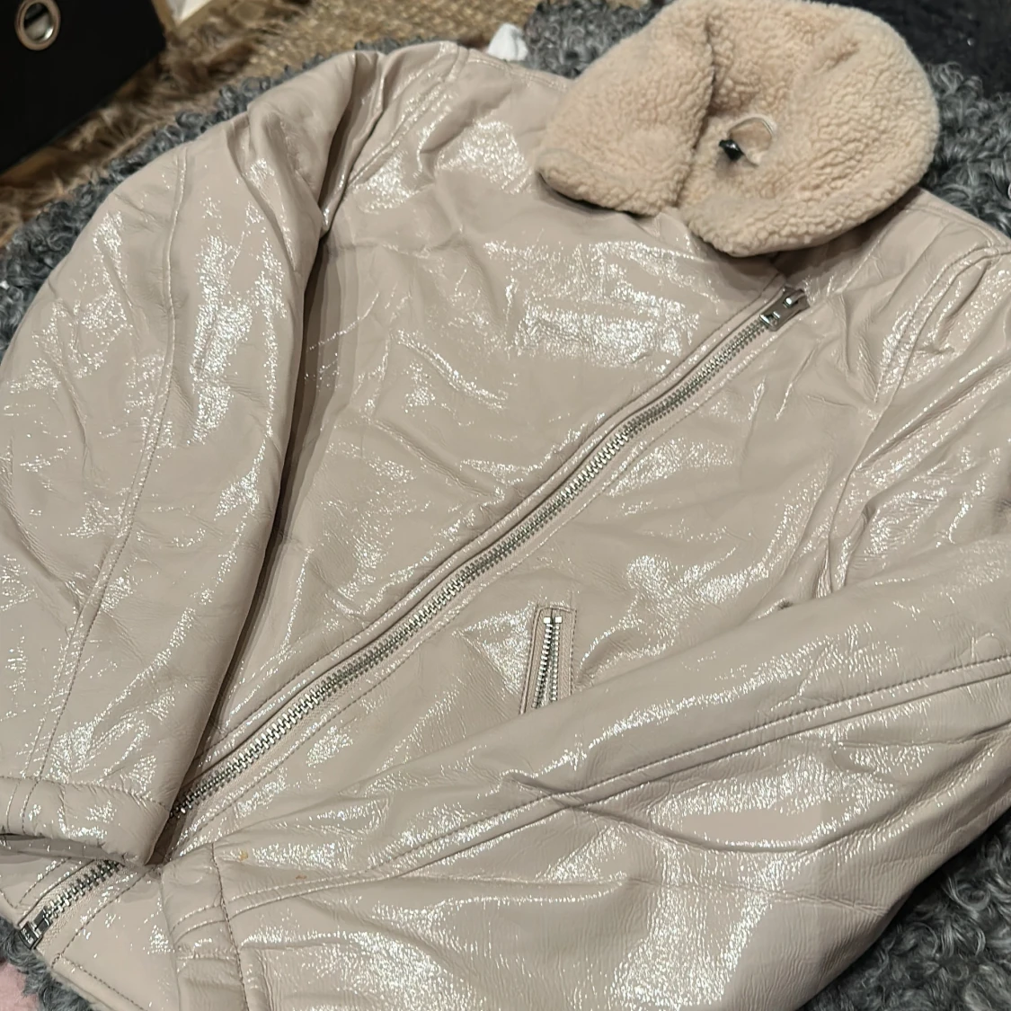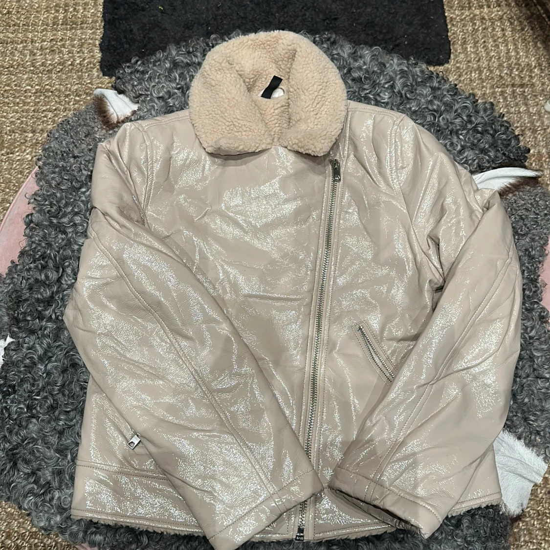 En pilefodrad bikerjacka i lackad läderimitation. Jackan har krage och slag samt snedställd dragkedja fram. Sidfickor med dragkedja.