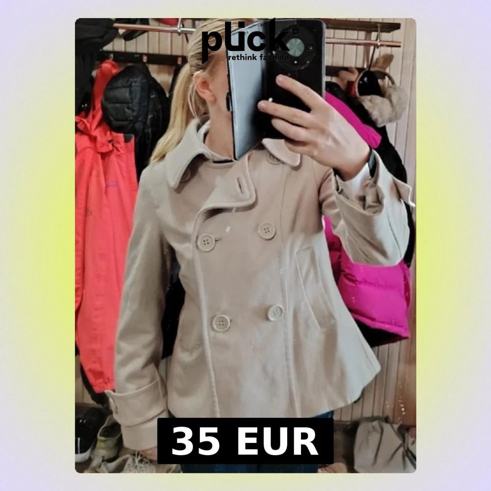 Stilren beige jacka från H&M med dubbelknäppning och stora knappar framtill. Jackan har bred krage, två snedställda fickor och är tillverkad i ett mjukt tyg som känns som bomull. Perfekt för dig som gillar klassisk men avslappnad stil.🍀 XS-M. Kolla in på andra ads!!