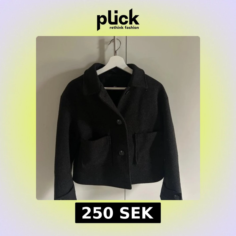 Stilren svart kappa i ullmaterial. Jackan har en rak, croppad passform med stora framfickor, klassisk krage och knäppning med stora knappar framtill. Perfekt för dig som gillar minimalistisk och clean stil.