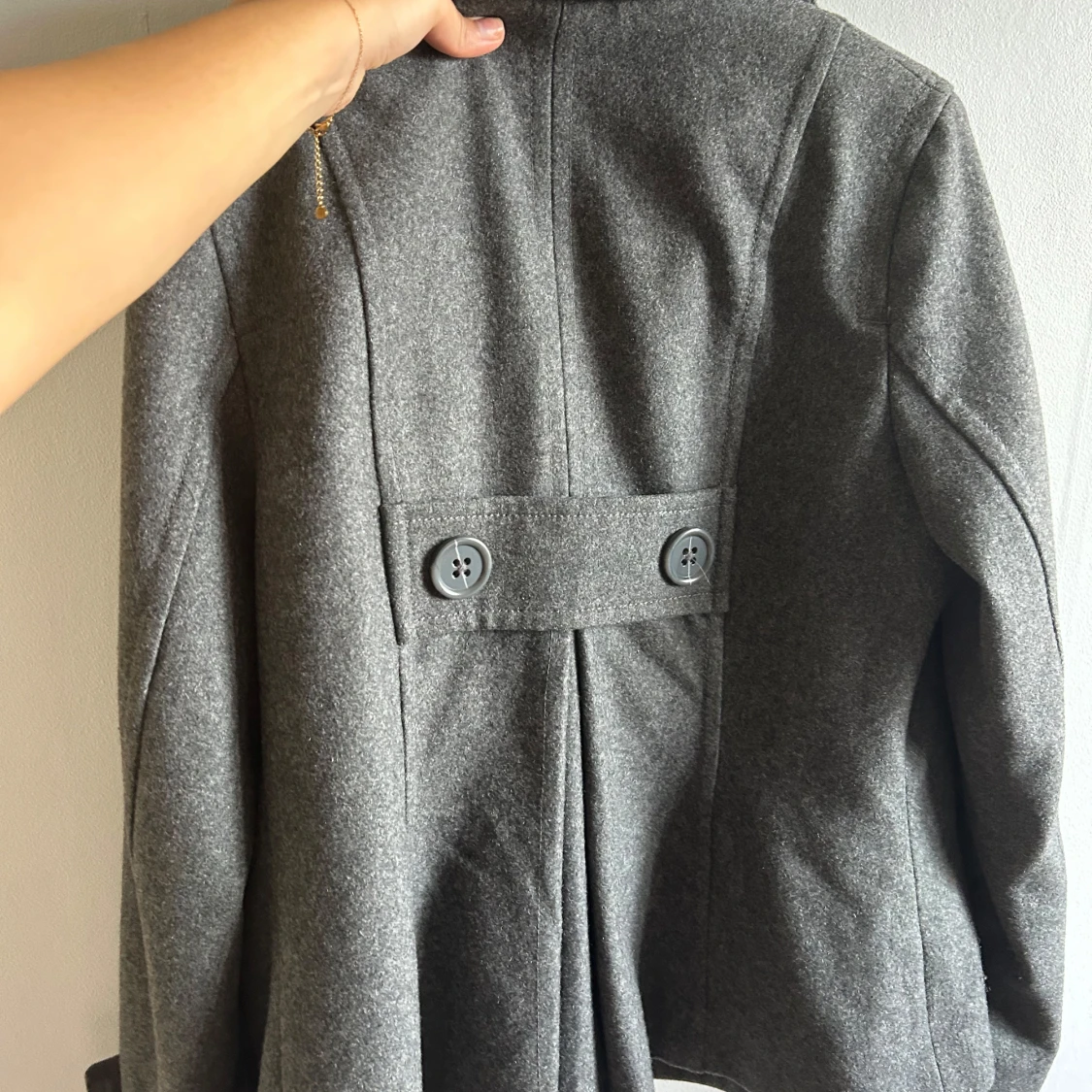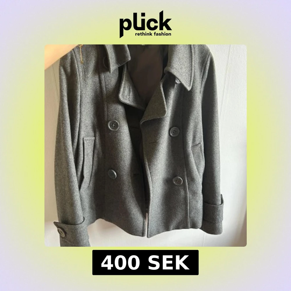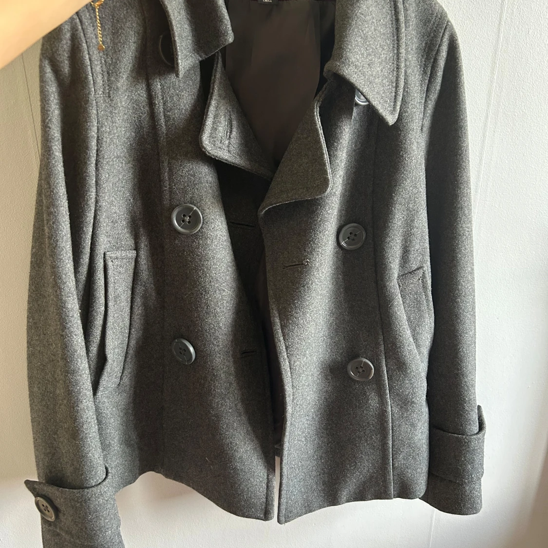 Stilren grå skepparkavaj med dubbelknäppning och bred krage. Jackan har stora knappar framtill och dekorativa knappar bak, samt fickor på sidorna. Perfekt för dig som vill ha en klassisk och snygg look under höst och vinter.