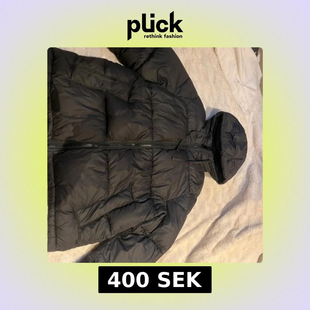 Säljer en svart pufferjacka med huva och dragkedja framtill. Jackan är quiltad och har en klassisk, lite oversized passform som håller dig varm under kalla dagar. Perfekt för dig som vill ha en stilren och enkel vinterjacka.