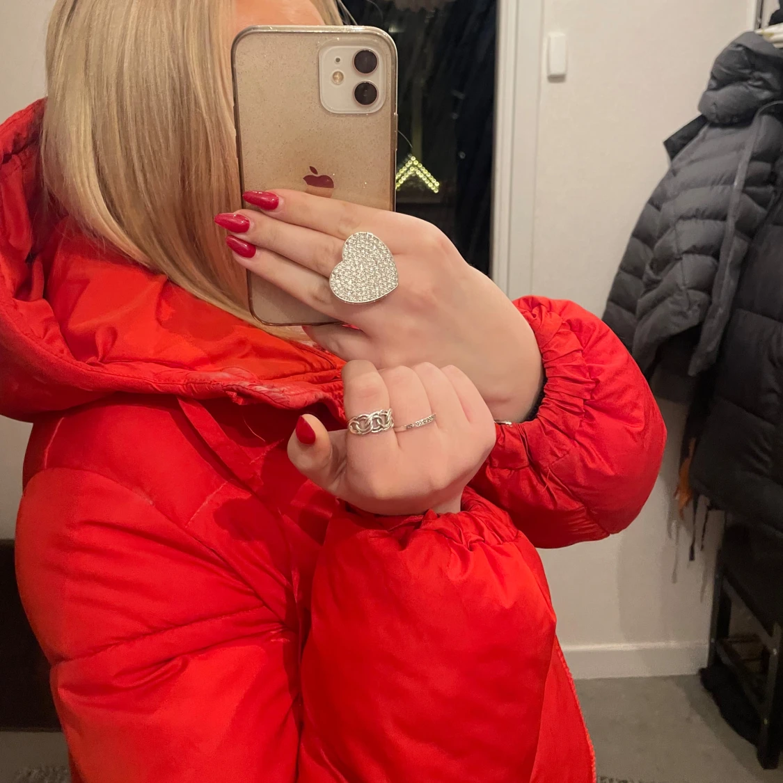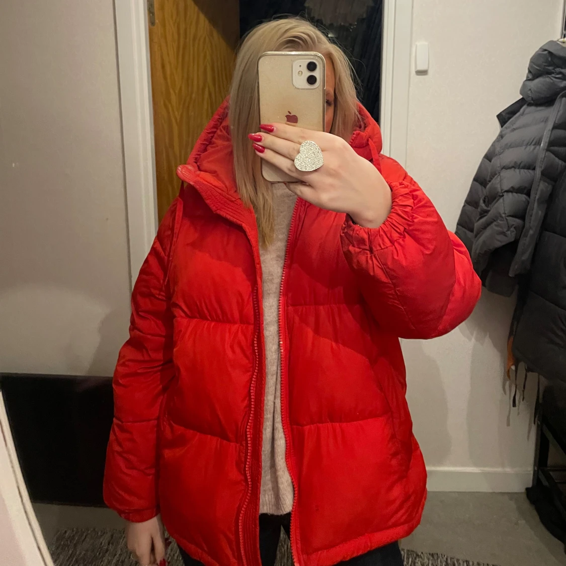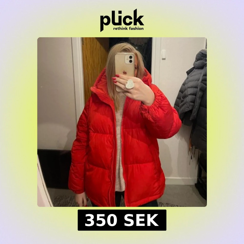 Säljer en snygg röd pufferjacka med dragkedja. Jackan har en oversized passform och långa ärmar, perfekt för kyliga dagar. Den är både trendig och bekväm.