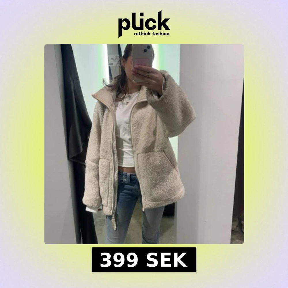 Mysig och oversized beige teddyjacka med stora fickor framtill och dragkedja hela vägen. Jackan har hög krage och lång ärm, perfekt för kyliga dagar. Passar dig som gillar en chill och trendig stil. Lite sminkfläckar vid kragen som man ser p bild 2 o 3.