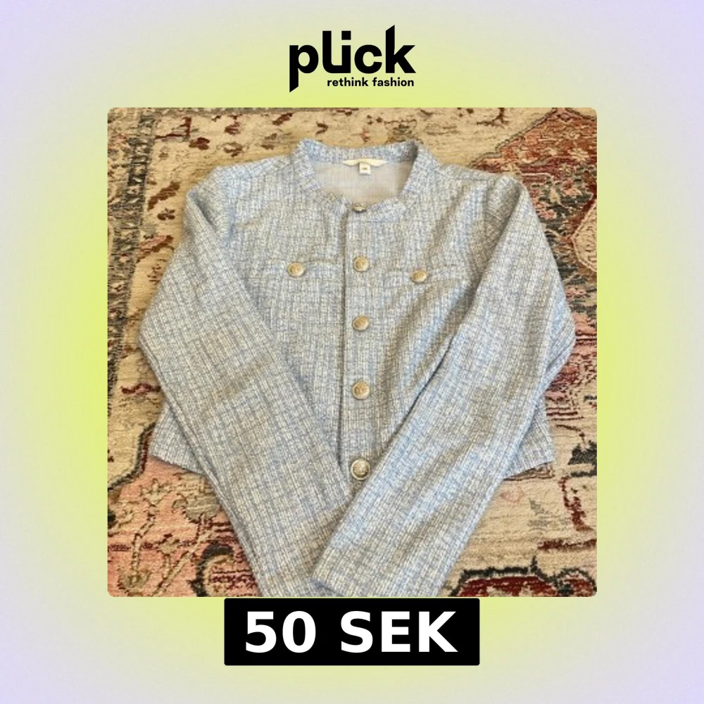 Snygg blåvit cardigan jacka från H&M med strukturerat tyg och dekorativa guldknappar framtill. Jackan har rund halsringning, lång ärm och ett klassiskt rutigt mönster. Perfekt för att lyfta din outfit med en chic touch.