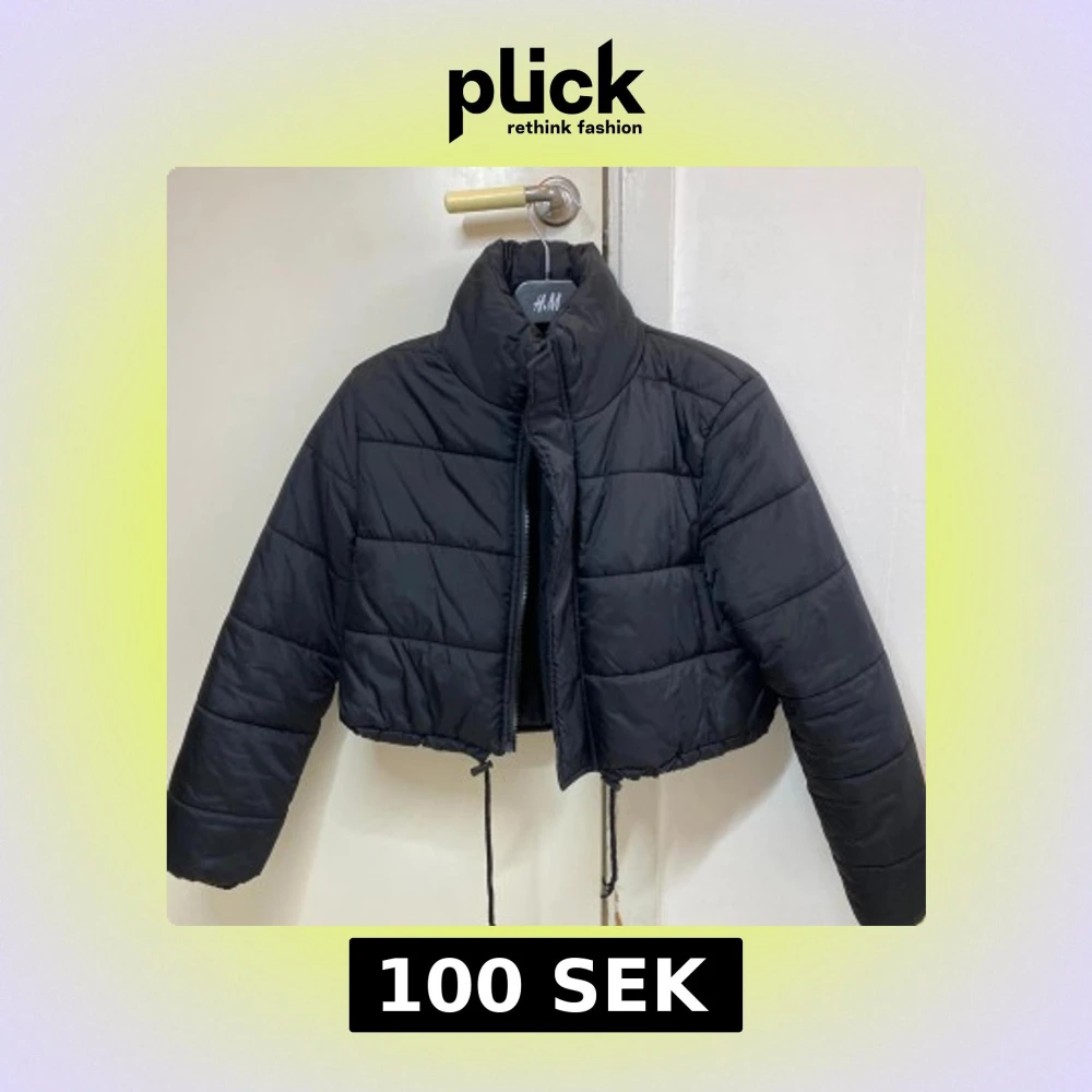 Snygg svart croppad pufferjacka från H&M med dragkedja framtill. Jackan har en hög krage och långa ärmar, perfekt för kyligare dagar. Den har en modern och trendig look som passar till många olika stilar.