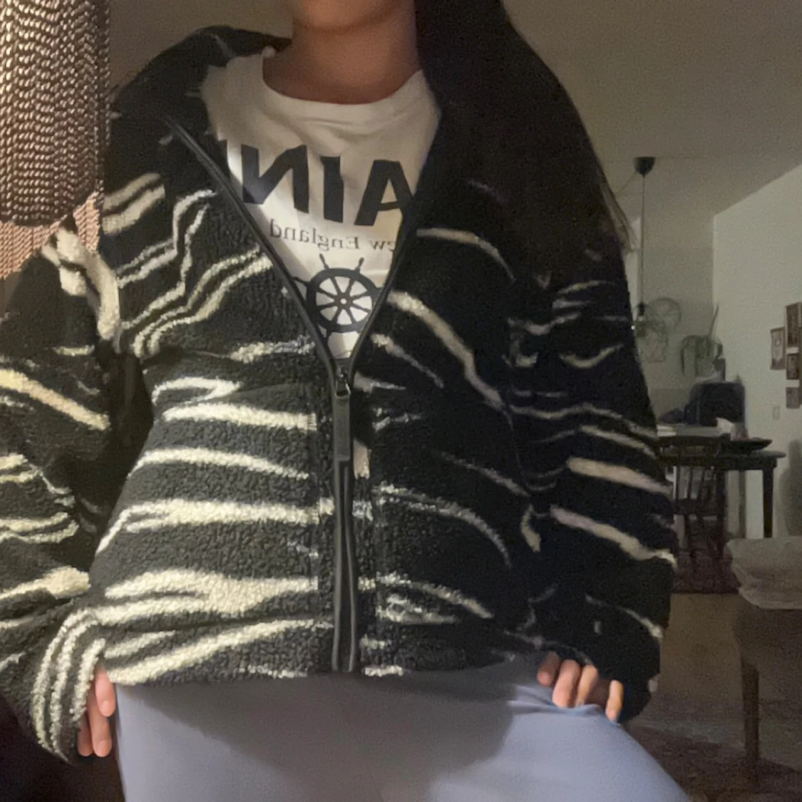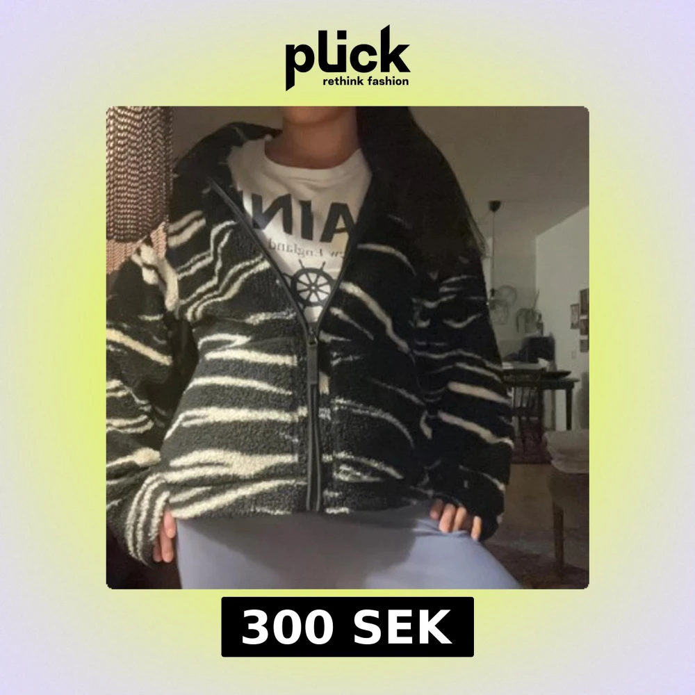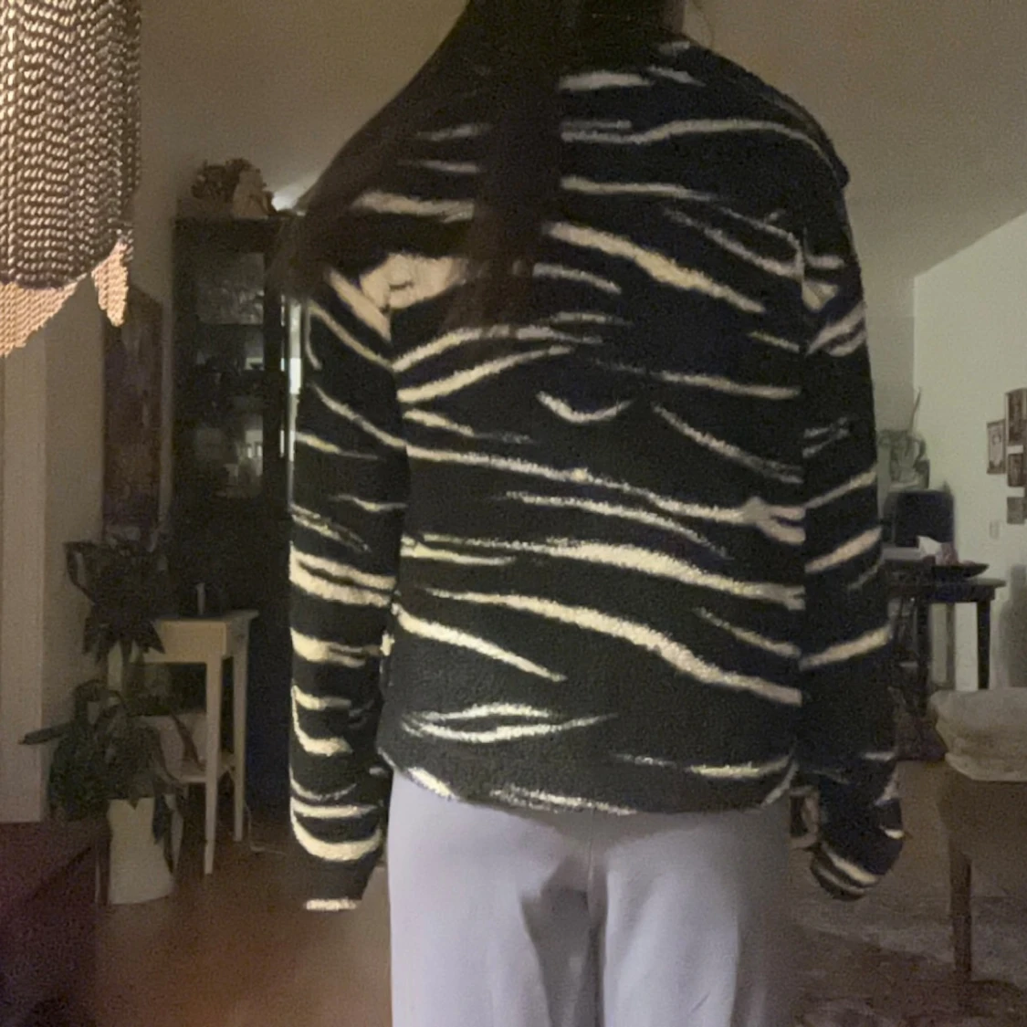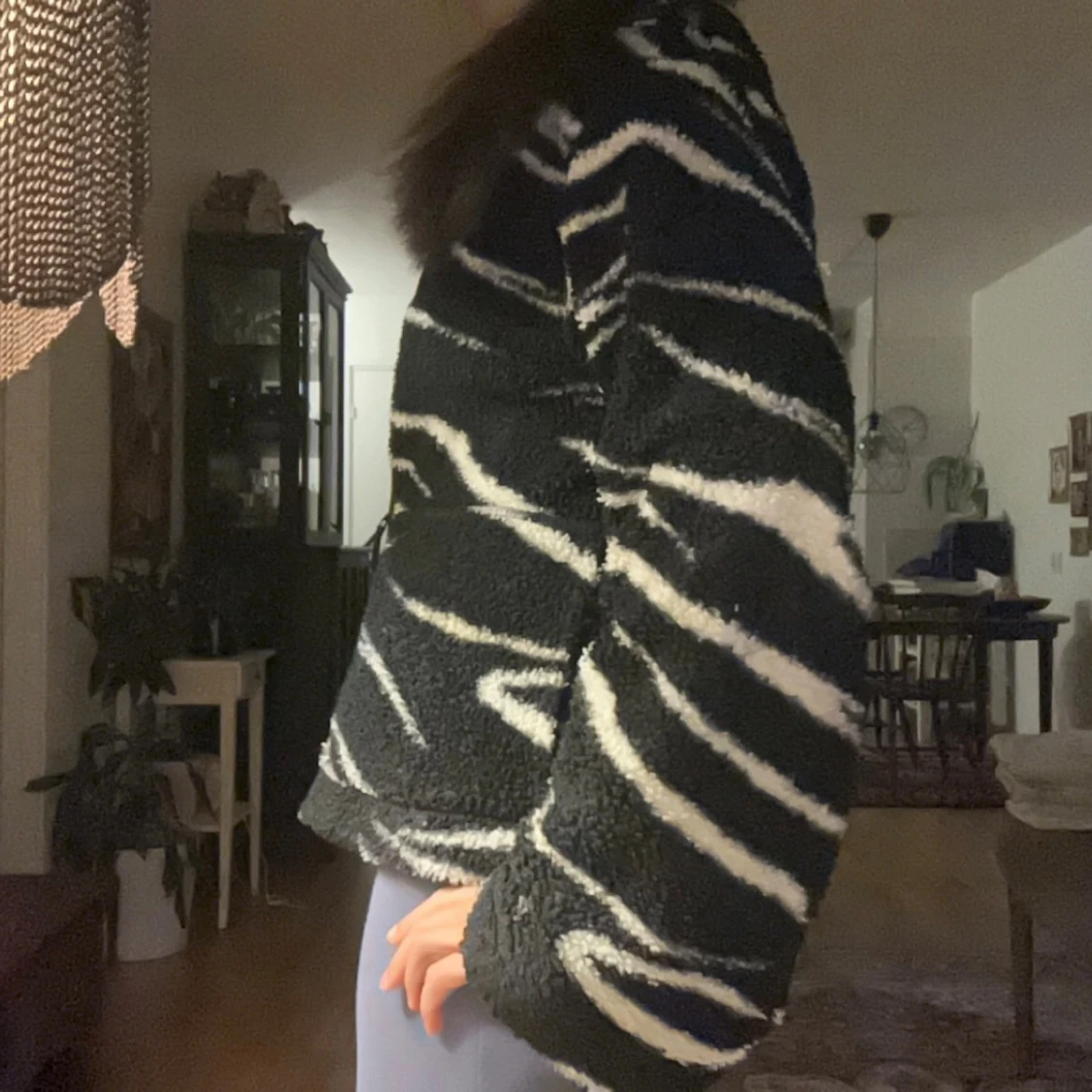 Säljer en svart teddyjacka från HM i storlek S med vit zebramönstrad design. Jackan har dragkedja framtill, långärmade ärmar och är gjord i mjukt fleece-material. Perfekt för dig som vill sticka ut med en cool och mysig look.