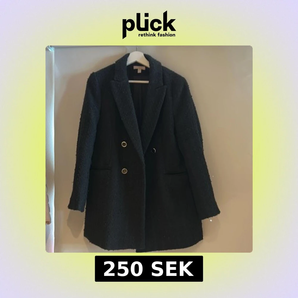 Stilren svart kappa från H&M med dubbelknäppning och snygga guldiga knappar. Jackan har en rak passform, klassisk krage och två fickor framtill. Materialet är strukturerat och ger en cool känsla. Perfekt för dig som vill ha en tidlös look.