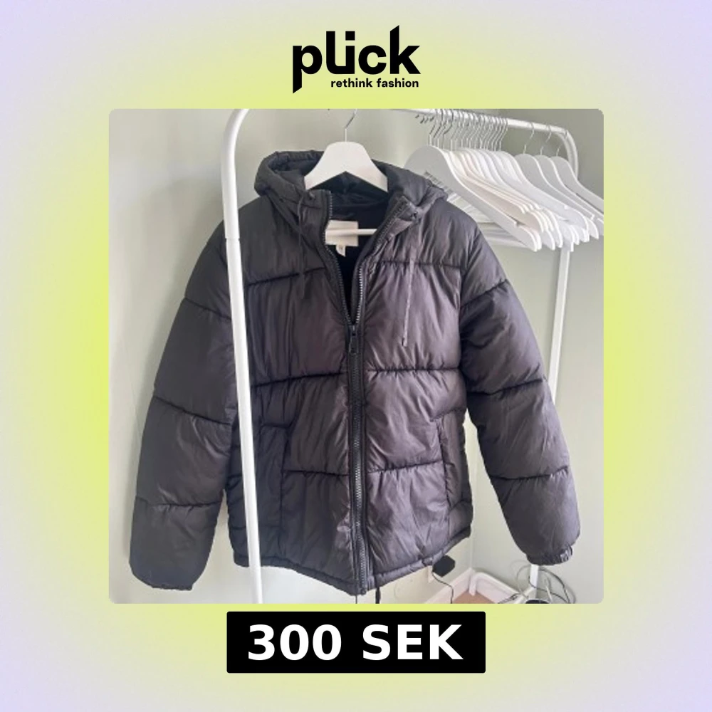 Svart pufferjacka från H&M med huva och dragkedja framtill.