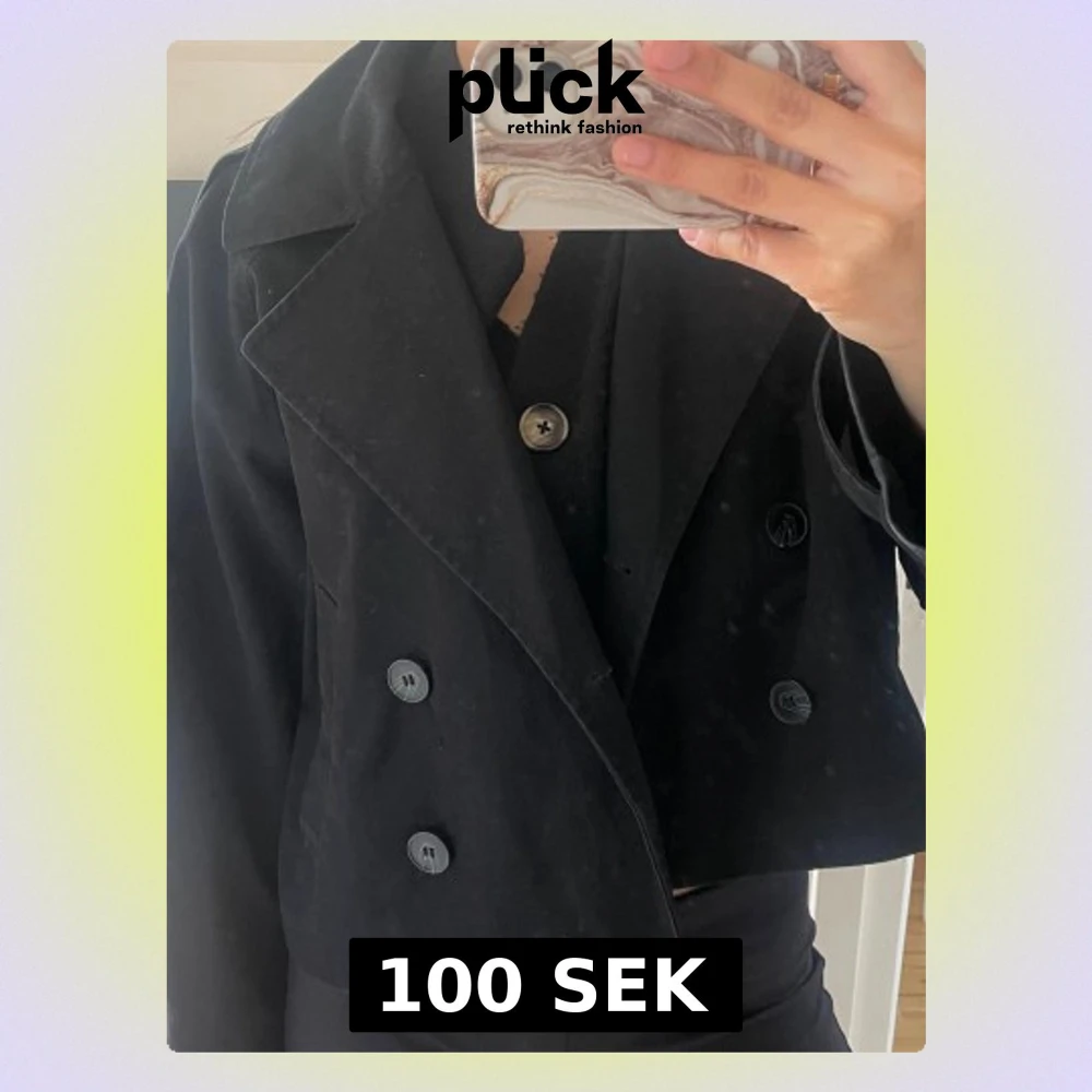 Svart skepparkavaj från H&M med dubbelknäppning och breda slag. Jackan är croppad och har långa ärmar med knappar vid ärmslut. Perfekt för dig som vill ha en stilren och trendig look. Materialet är bomull och passformen är loose.