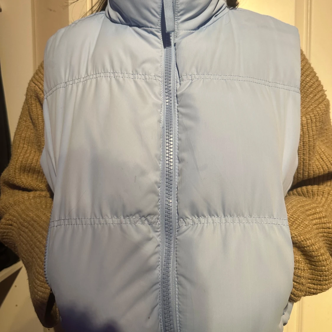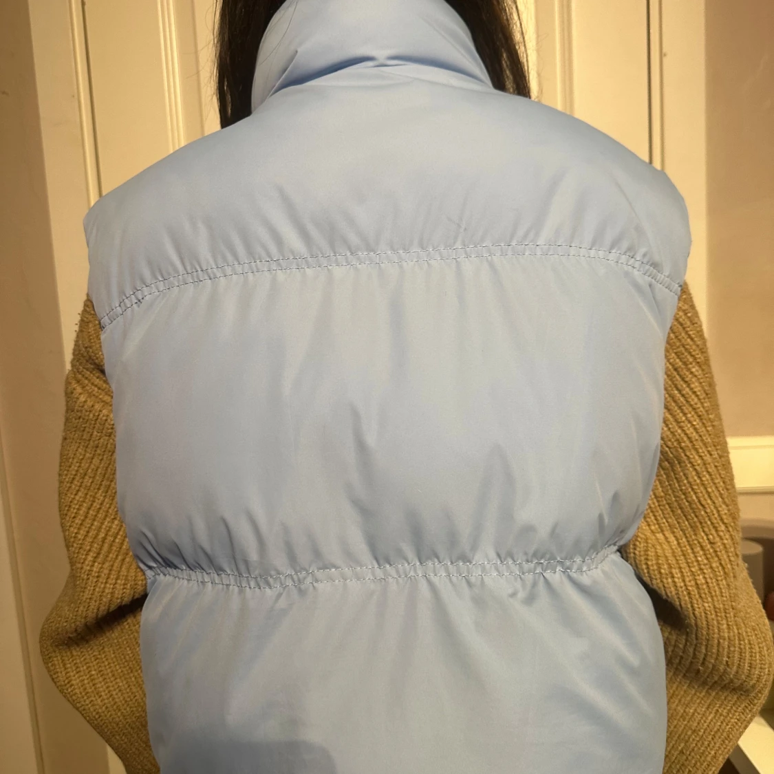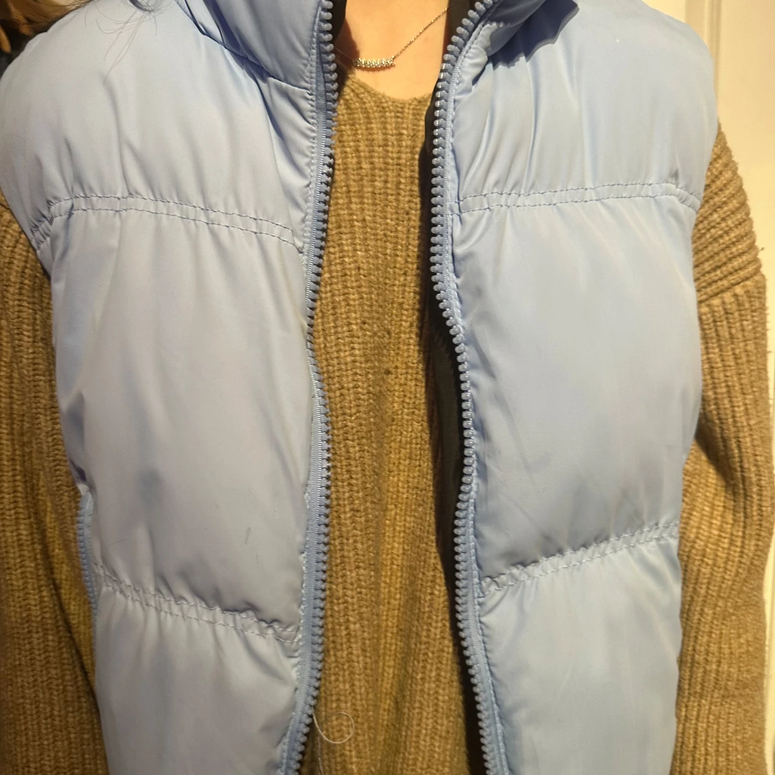 Säljer en ljusblå dunväst med dragkedja. Perfekt för kyliga dagar när du vill hålla värmen utan att bära en jacka. Västen har en hög krage och en stilren design.