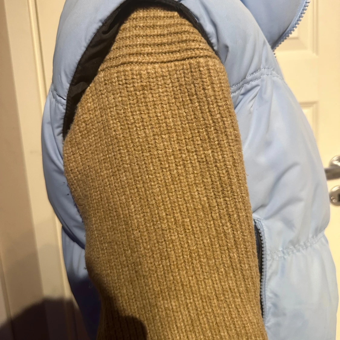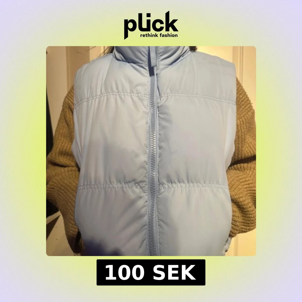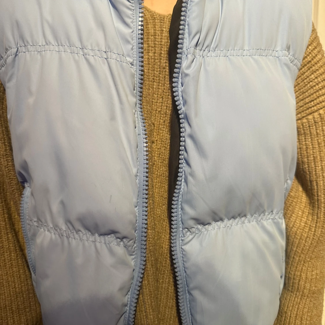 Säljer en ljusblå dunväst med dragkedja. Perfekt för kyliga dagar när du vill hålla värmen utan att bära en jacka. Västen har en hög krage och en stilren design.