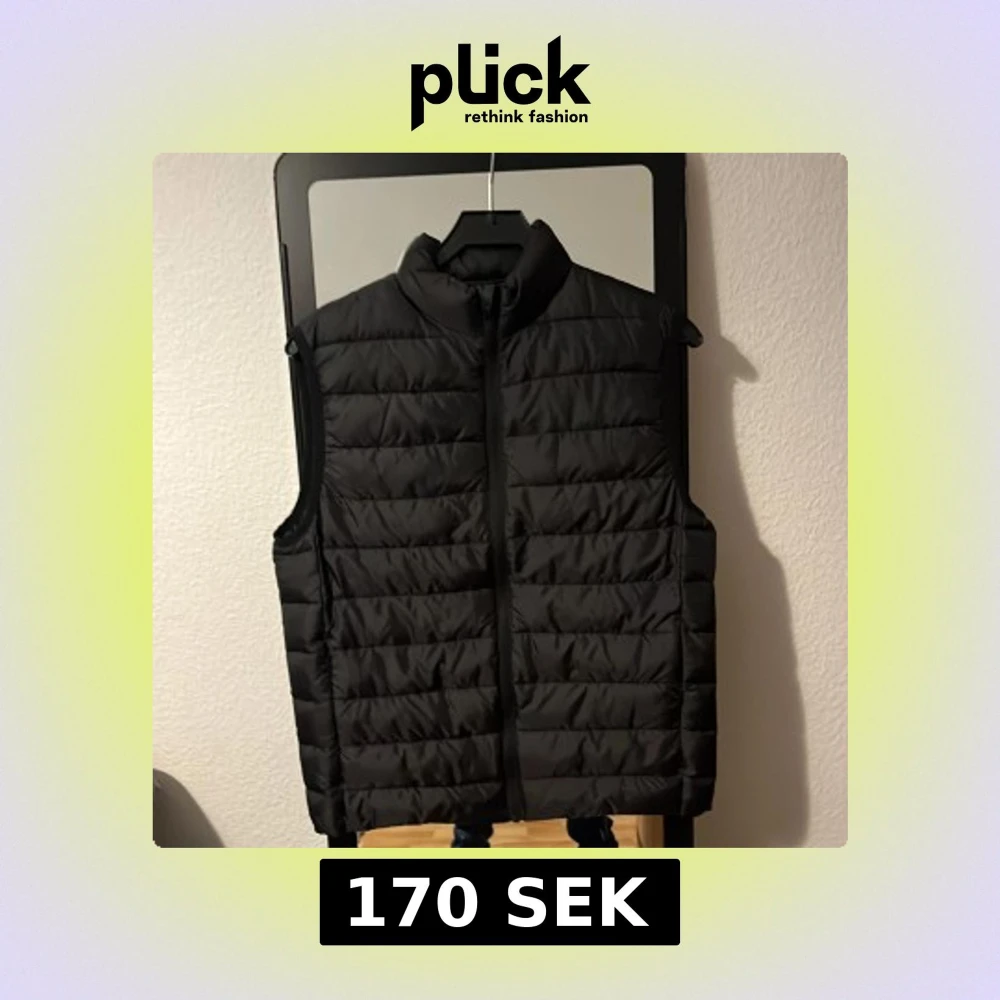 Svart dunväst från H&M i storlek S med quiltad design och dragkedja framtill. Västen har en hög krage och är tillverkad i syntetmaterial. Perfekt att slänga över en hoodie för extra värme under höst och vinter.