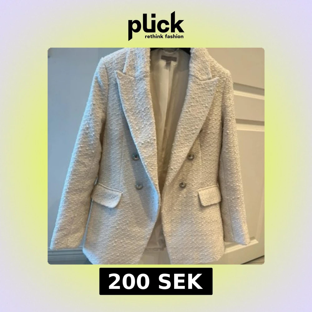 Snygg vit kavaj från H&M i bouclé-tyg med dubbelknäppning och klassiska slag. Jackan har två fickor med lock framtill och en strukturerad, lite lyxig känsla. Perfekt för dig som gillar stilrena och trendiga plagg med lite edge.