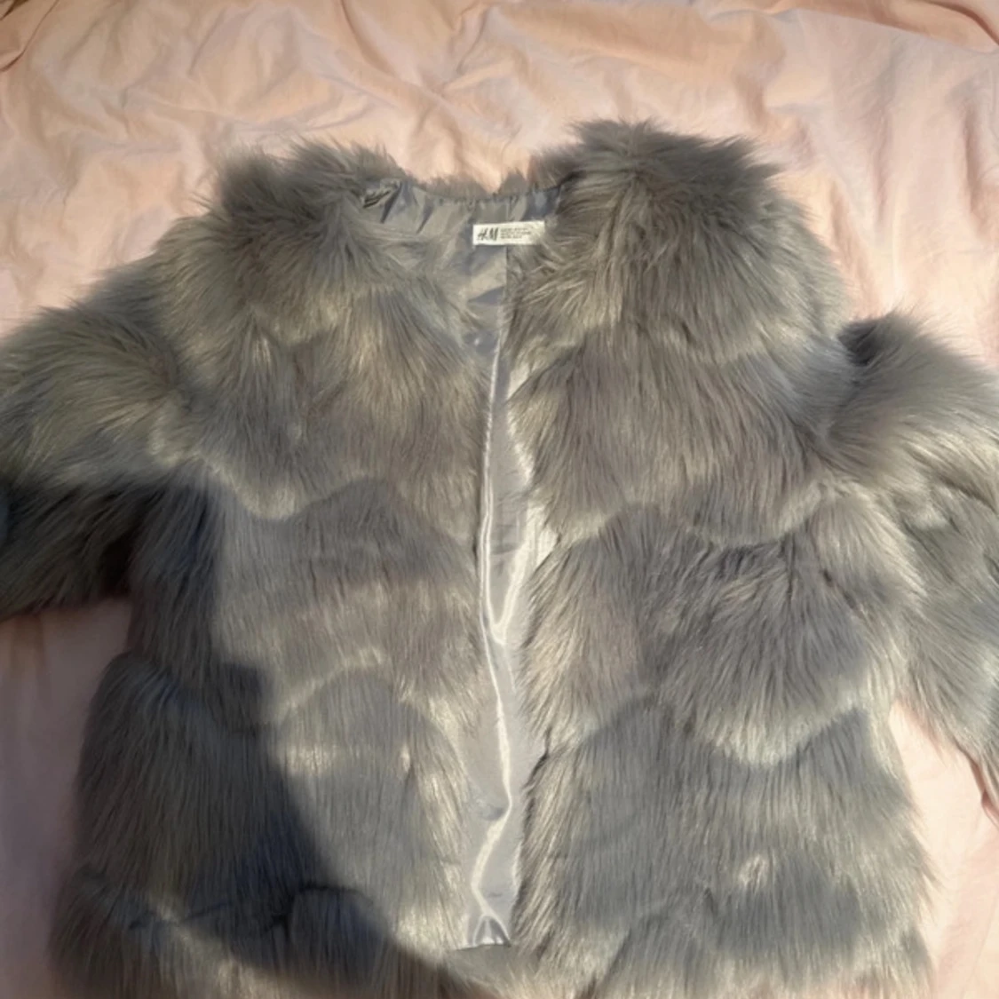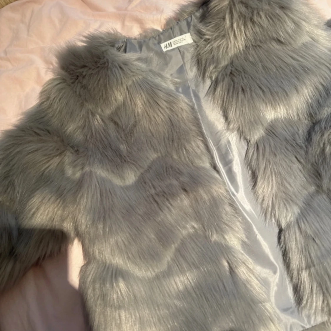 Säljer en fluffig och snygg grå pälsjacka från H&M. Jackan har en rundad krage och är helfodrad med silkeslen insida. Perfekt för dig som vill ha en statement piece med lyxig vibe och mjuk känsla. Jackan har lång ärm och en loose passform.