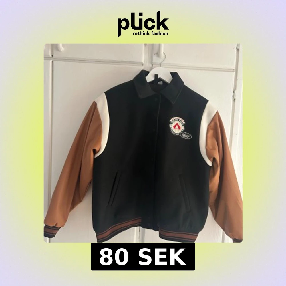 Snygg svart bomberjacka med bruna ärmar och vita detaljer från Outdoor Camper. Jackan har broderade patches framtill och stort tryck med '1990' på ryggen. Klassisk college-stil med ribbade muddar och knappar framtill. Perfekt för dig som gillar retrovibbar.