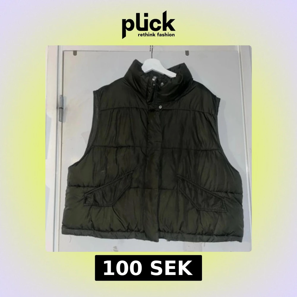 Säljer en mörkgrön dunväst med hög krage och dragkedja framtill. Västen har två snedställda fickor med lock och quiltad design. Perfekt för lager-på-lager och ger en cool, avslappnad look. Passar dig som gillar streetstyle och vill hålla dig varm.