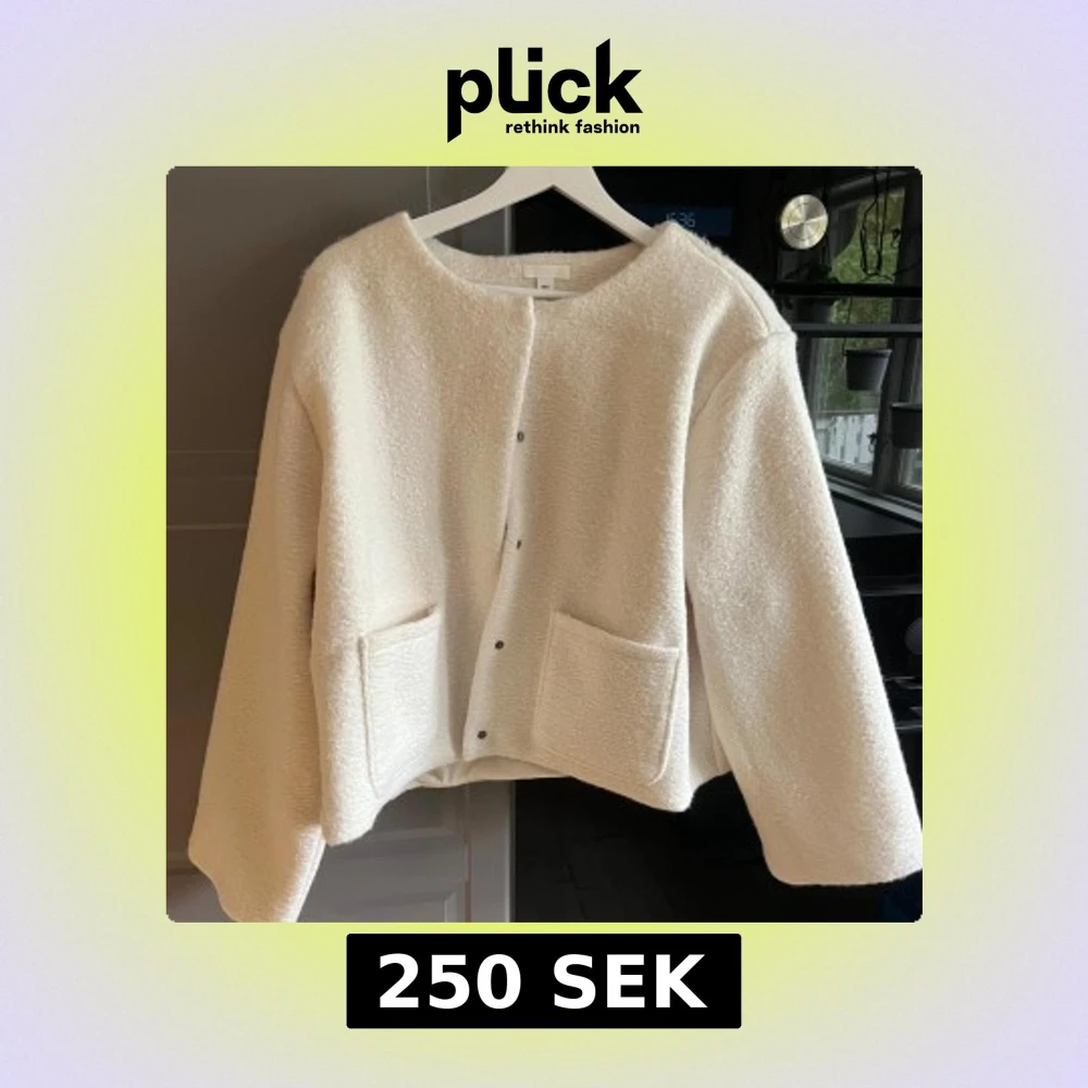 Säljer en vit teddyjacka med rund halsringning och stora framfickor. Jackan har tryckknappar framtill och är croppad i modellen. Perfekt för dig som gillar en mysig och trendig stil.