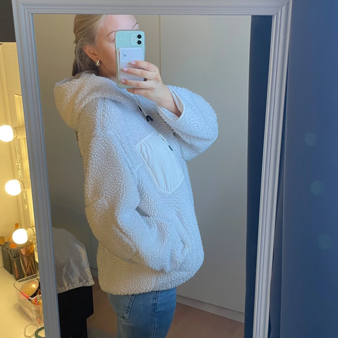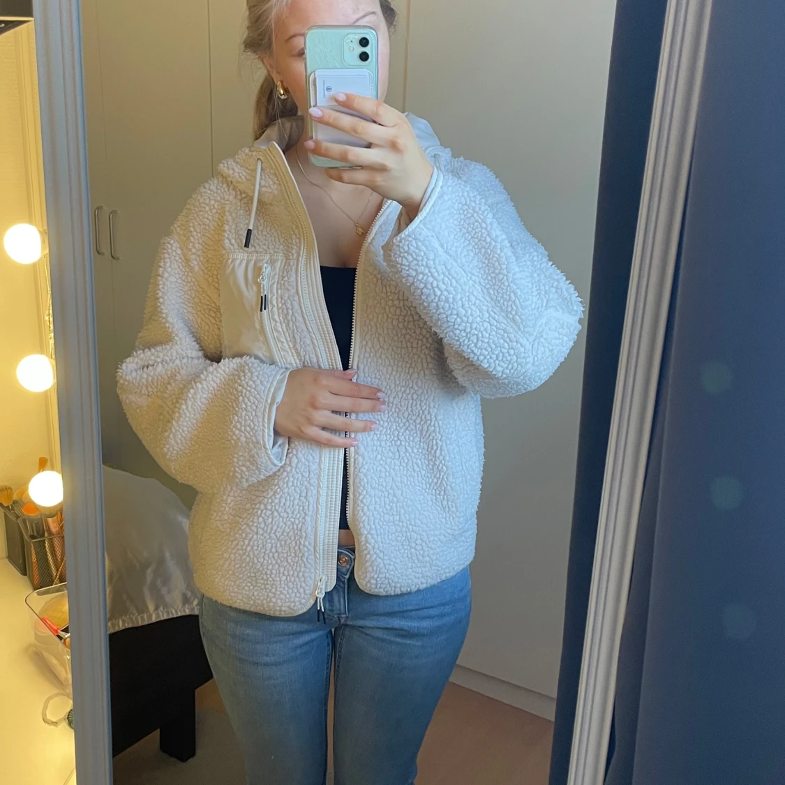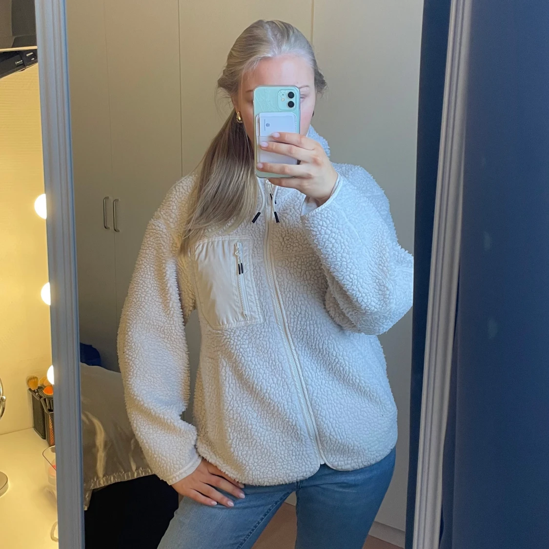 Mysig vit teddyjacka med dragkedja och hög krage. Jackan har en bröstficka med dragkedja och långa ärmar. Perfekt för kyligare dagar när du vill hålla dig varm och bekväm. Passar mig som vanligtvis bär storlek S