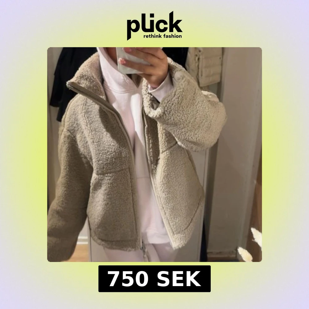 Mysig beige teddyjacka med hög krage och grov dragkedja framtill. Jackan har en loose passform och är tillverkad i fluffigt fleece-material som ger en chill och trendig vibe. Perfekt att slänga på över hoodien för extra värme.