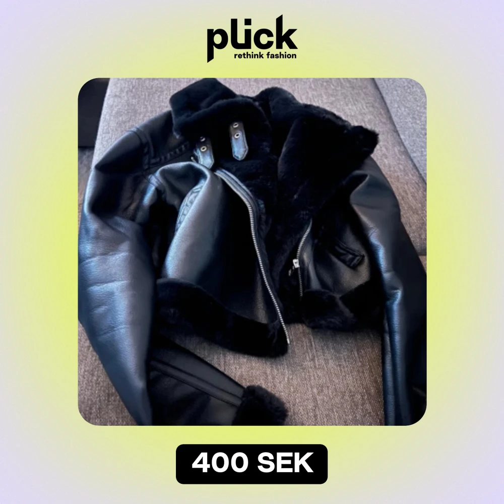 Har en svart skinnjacka med svart päls inuti. Sparsamt använd. Både päls och skinnet är fake. Storlek XS
