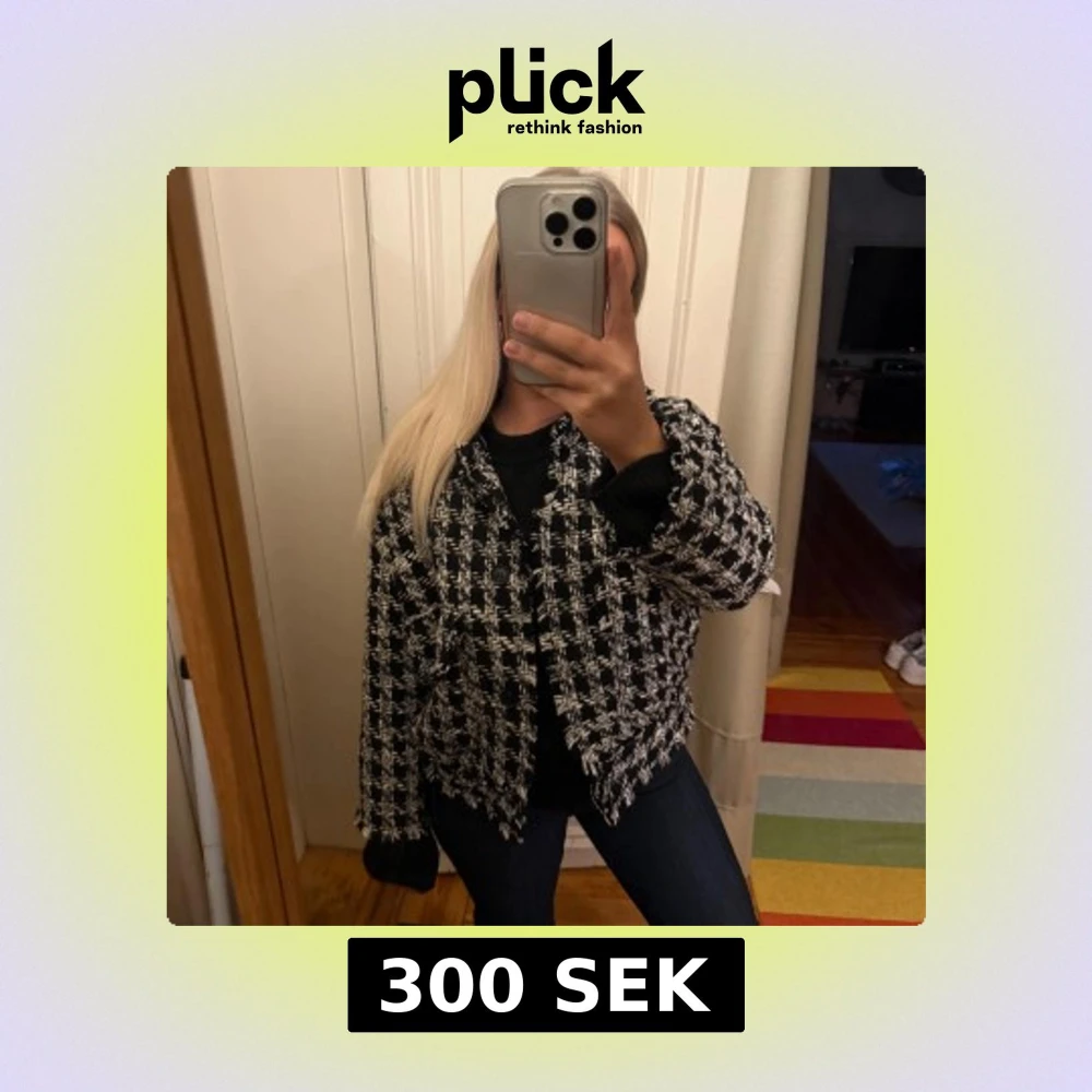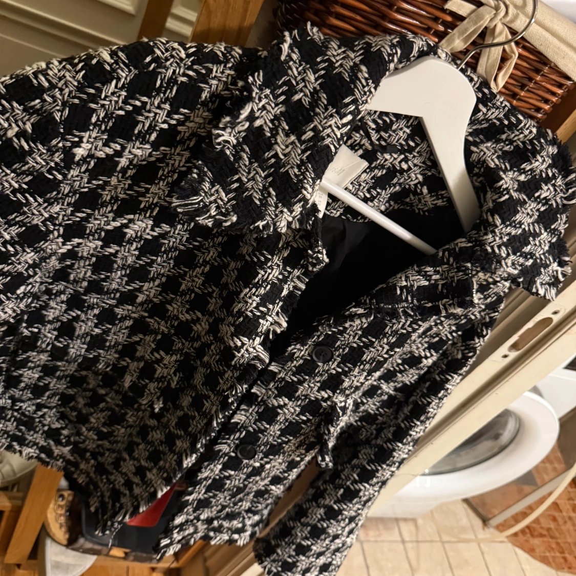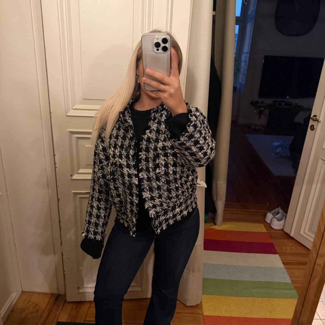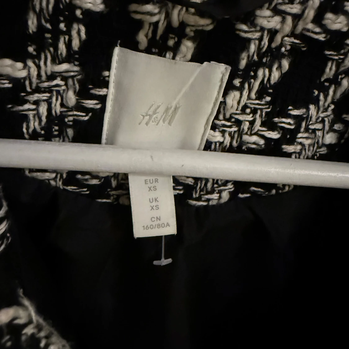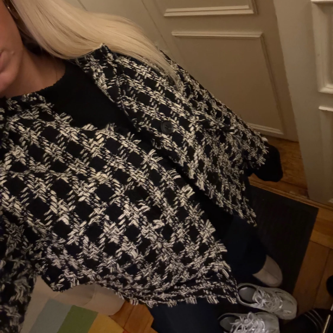 Säljer en snygg svartvit rutig kavajjacka från H&M i storlek XS. Jackan har en boxig passform, knappar framtill och är tillverkad i ett grovt vävt material.
