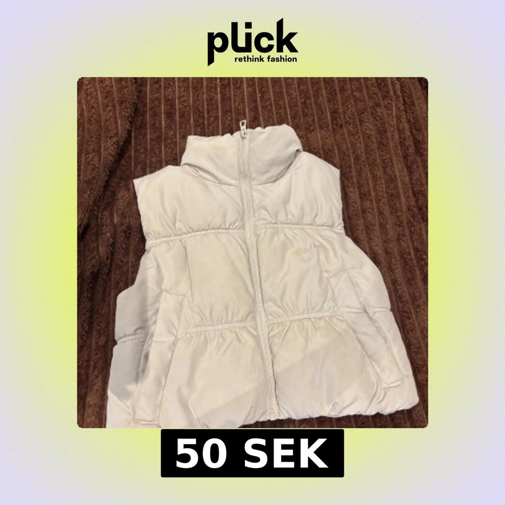 Säljer en vit dunväst i storlek XS med hög krage och dragkedja framtill. Västen har två fickor på sidorna och är quiltad för extra värme. Perfekt att slänga över en hoodie för en cool lager-på-lager-look. Den har en fläck vet inte om den går bort. Den är väldigt liten i storleken.