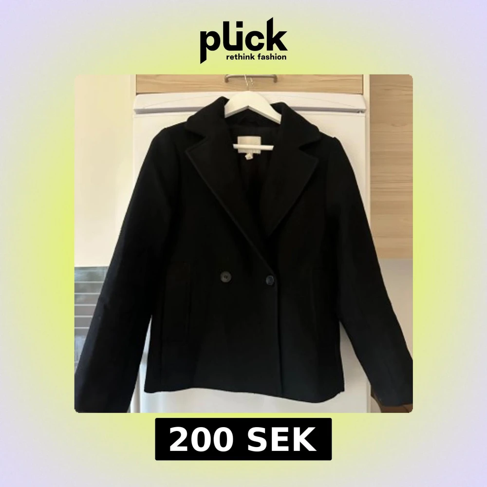 Snygg svart skepparkavaj i storlek XS med klassiska stora slag och dubbelknäppning framtill. Jackan har två rejäla fickor och är helsvart med stilren look. Perfekt för dig som gillar en tidlös och clean stil.