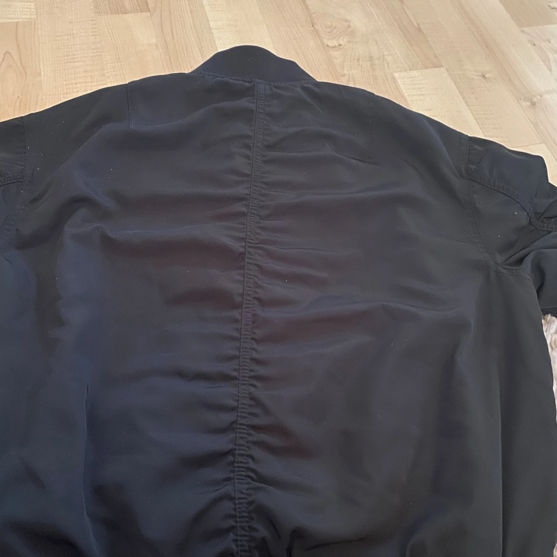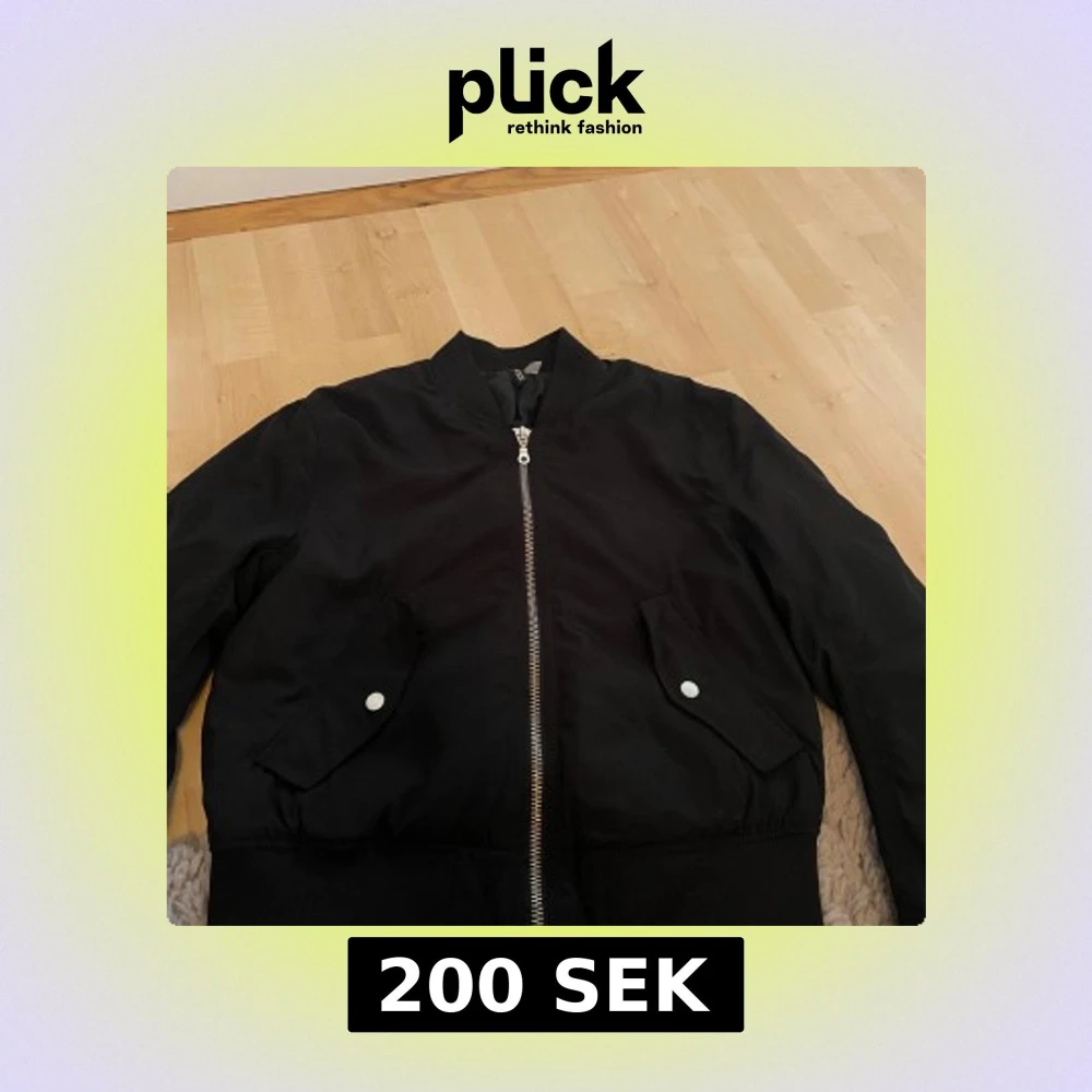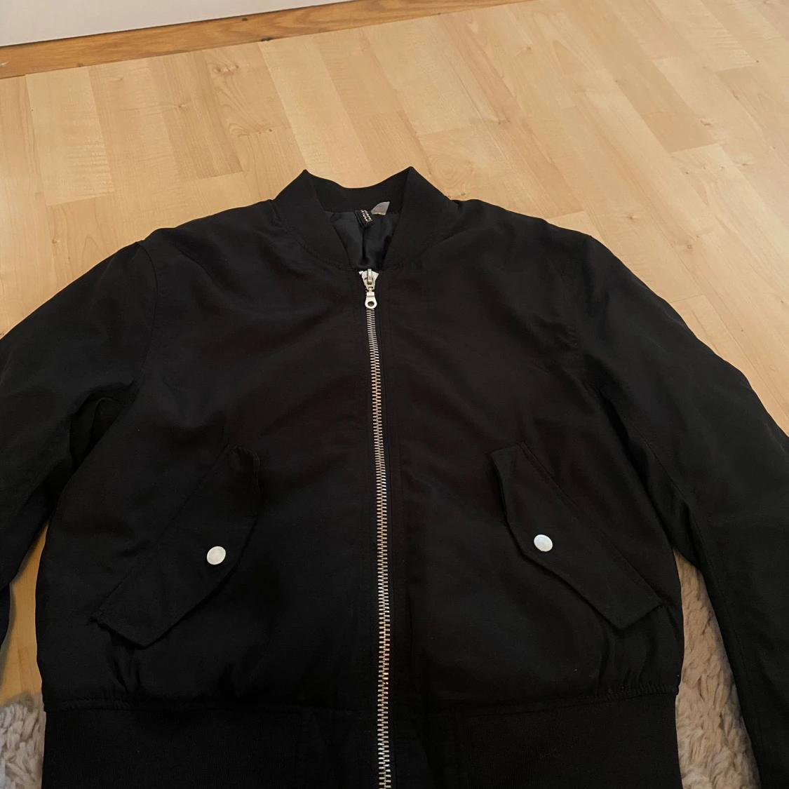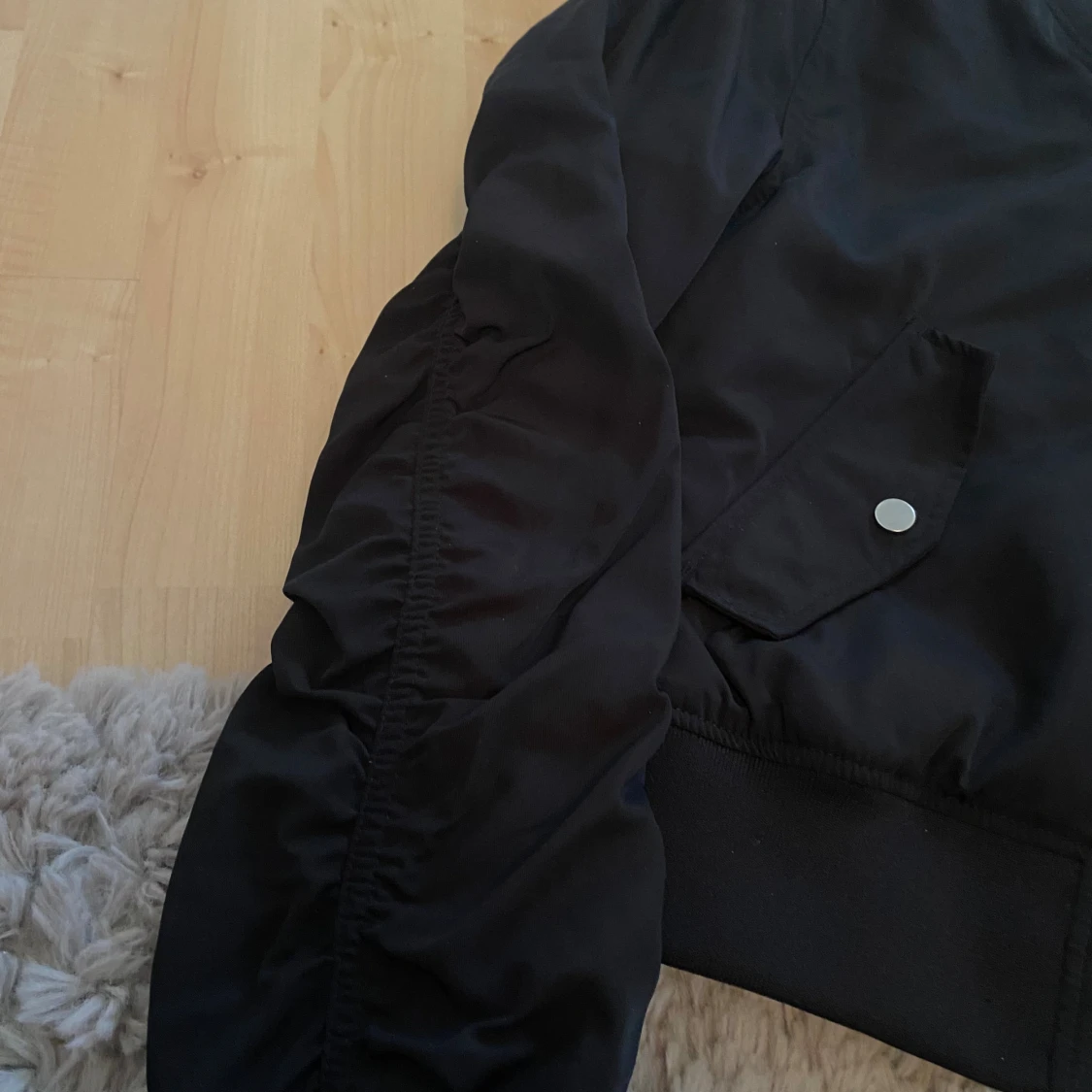 Säljer en svart bomberjacka med silvrig dragkedja framtill och två fickor med tryckknappar. Jackan har ribbade muddar vid midja och ärmslut samt en klassisk bomberkrage. Materialet känns lätt och smidigt, perfekt för lager-på-lager-stil. Köpte för 300 men säljer för 200 kr