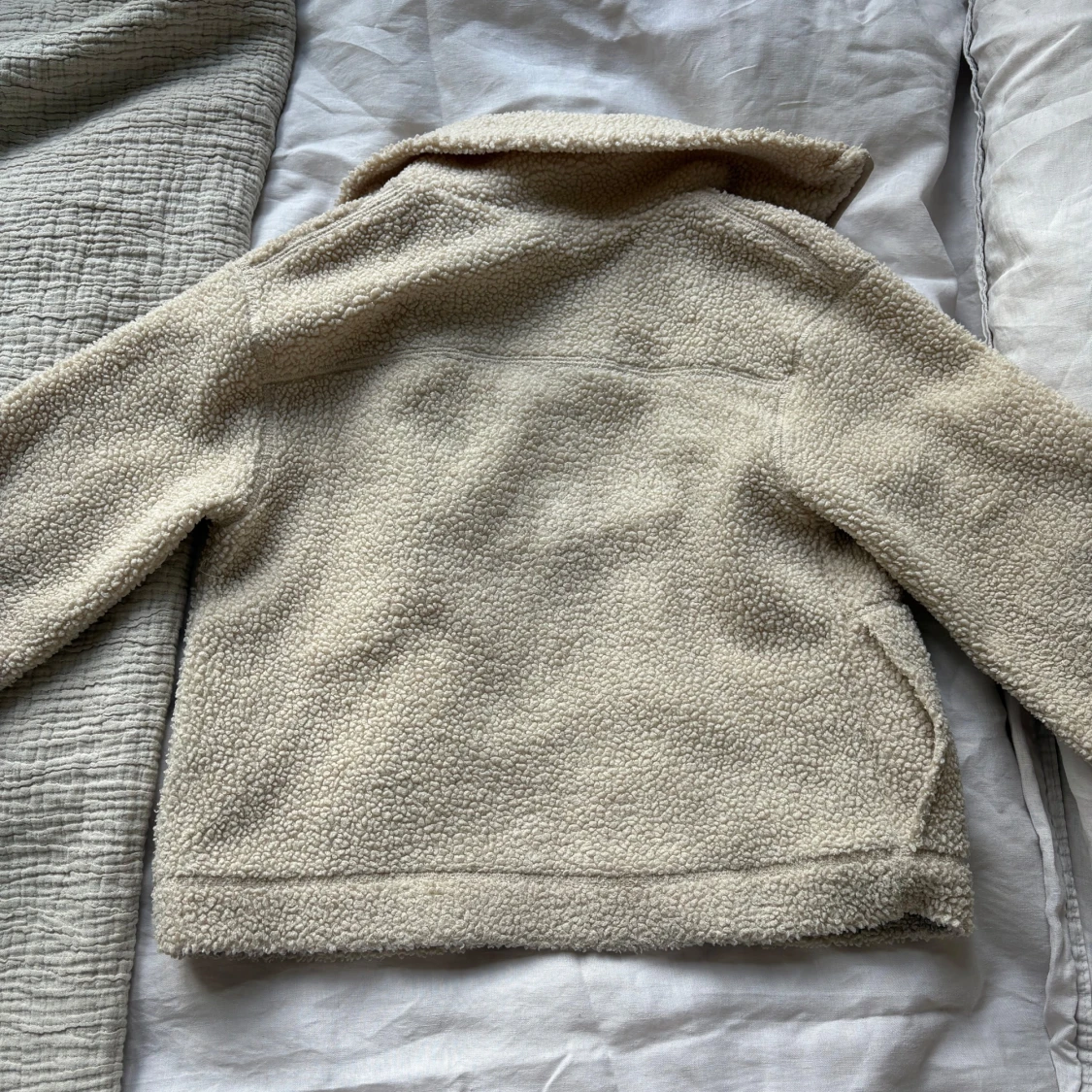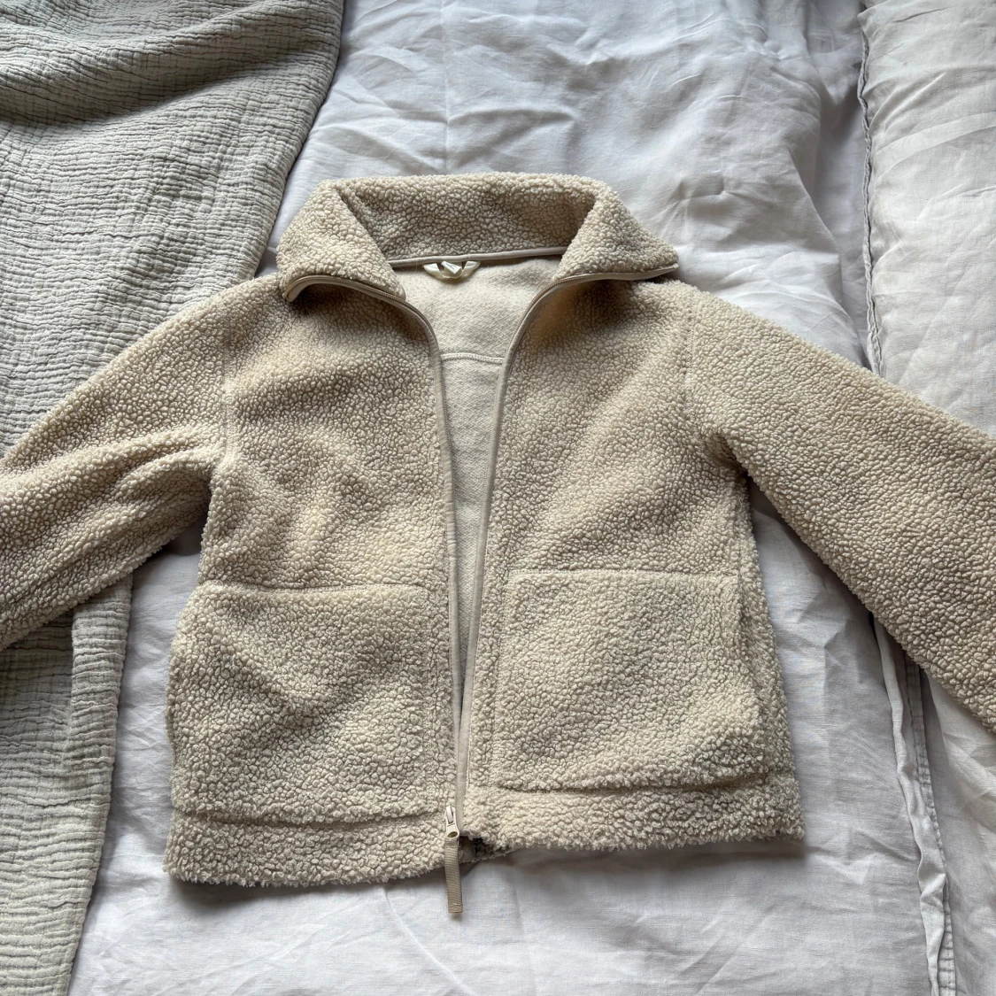 Mysig beige teddyjacka med två stora fickor framtill och hel dragkedja. Jackan har en hög krage och är tillverkad i fluffigt fleece-material som håller dig varm under kyliga dagar. Perfekt för lager-på-lager och chill vibes. Jackan är från HM i storlek xs och är varsamt använd men med lite slitage runt ändarna på armarna.💕💖